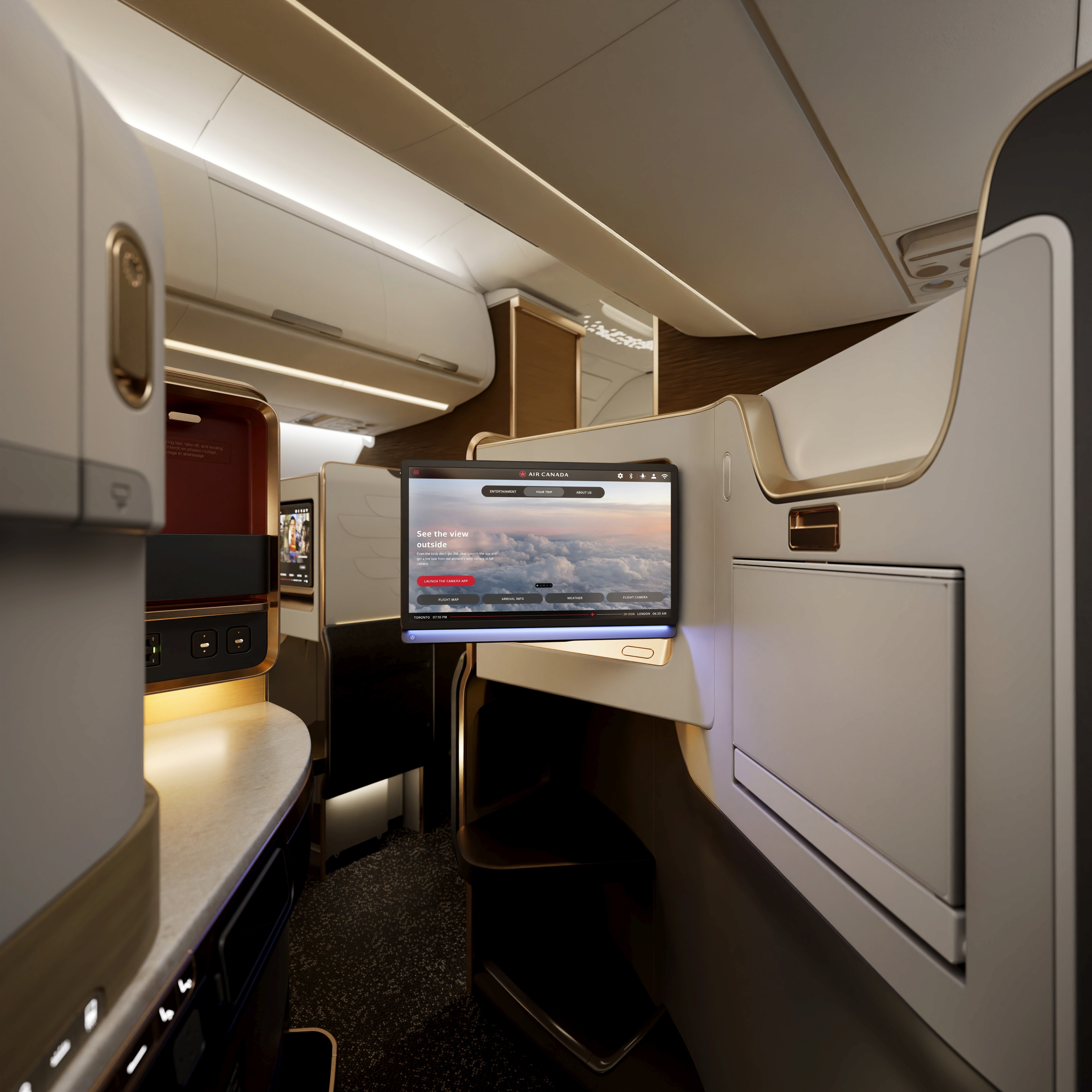 No Boeing 787-10, o destaque é a nova Air Canada Signature Plus Suite, posicionada na parte frontal da aeronave. As suítes oferecem cama de dois metros, mesa com tampo de quartzito, assento adicional para convidados e maior privacidade com divisórias elevadas.