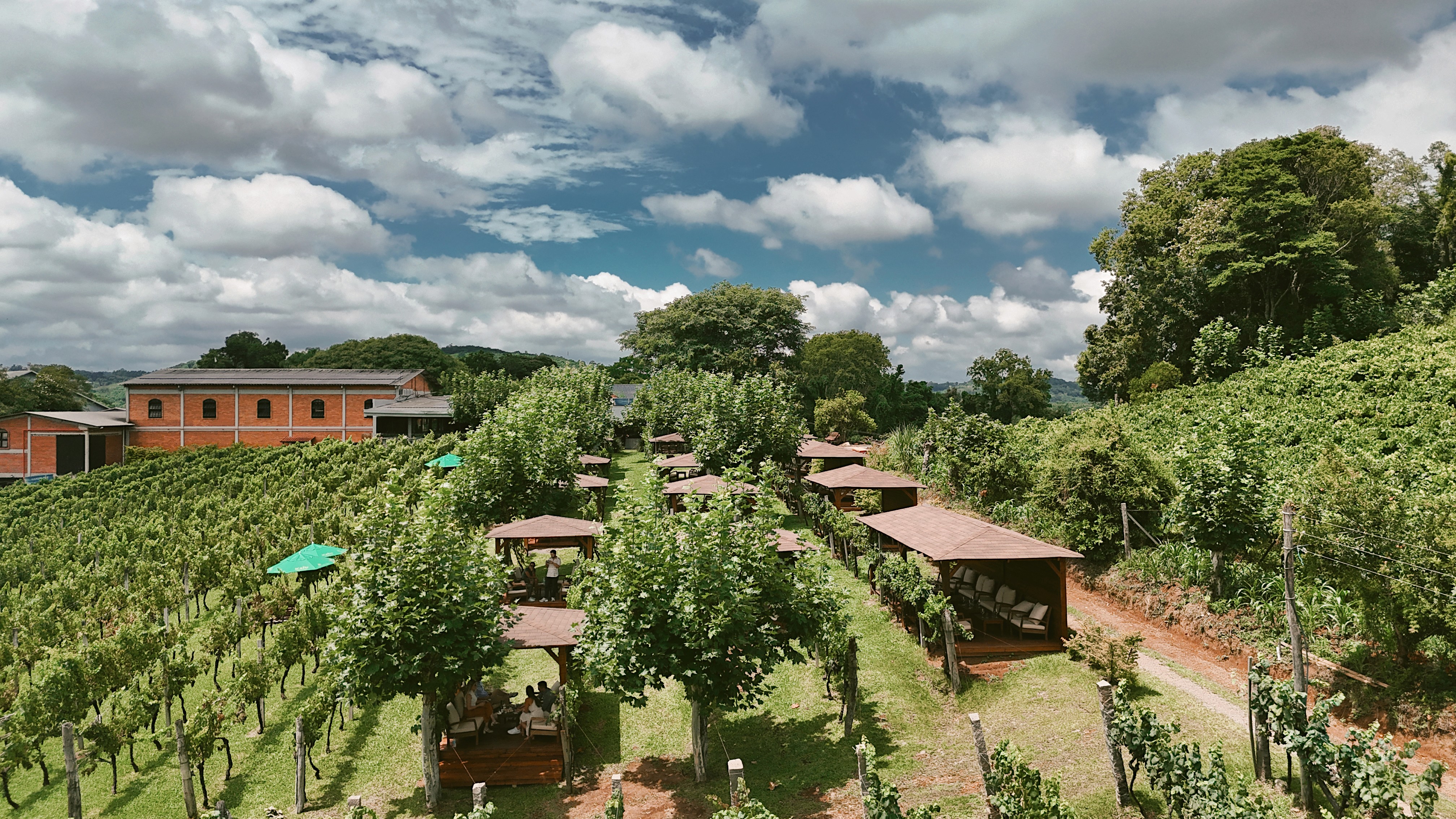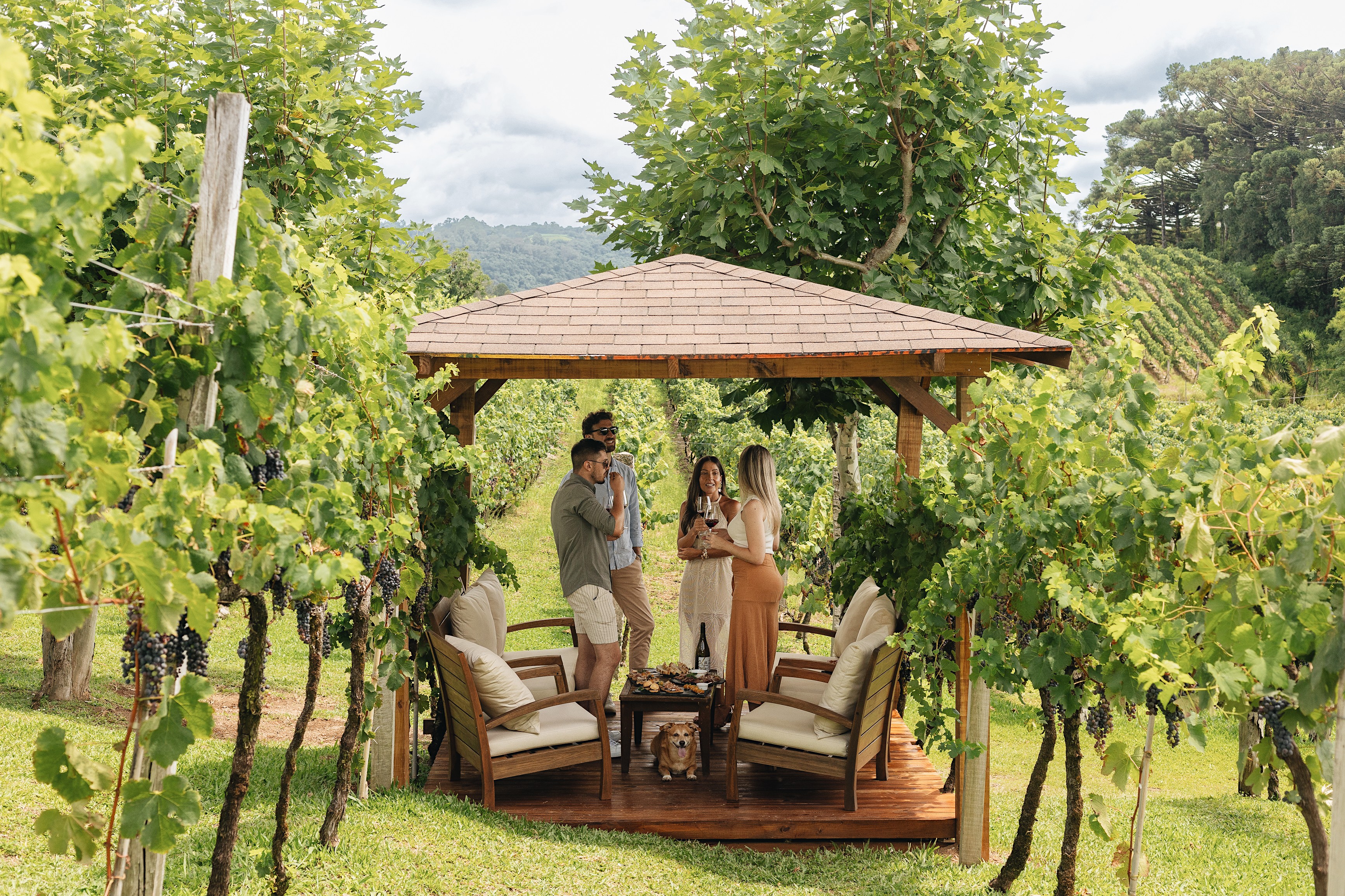 Os bangalôs passam a integrar o Larentis Lounge, espaço criado para aproximar o visitante do vinho, da natureza e da rotina da vinícola. Localizado atrás do prédio principal, o lounge se estende pelo vinhedo, acompanhando a geografia do terreno e revelando ao fundo a paisagem urbana de Bento Gonçalves. A proposta combina o ambiente rural com a vista da cidade, criando um cenário que convida à permanência e ao contato direto com o território do vinho.