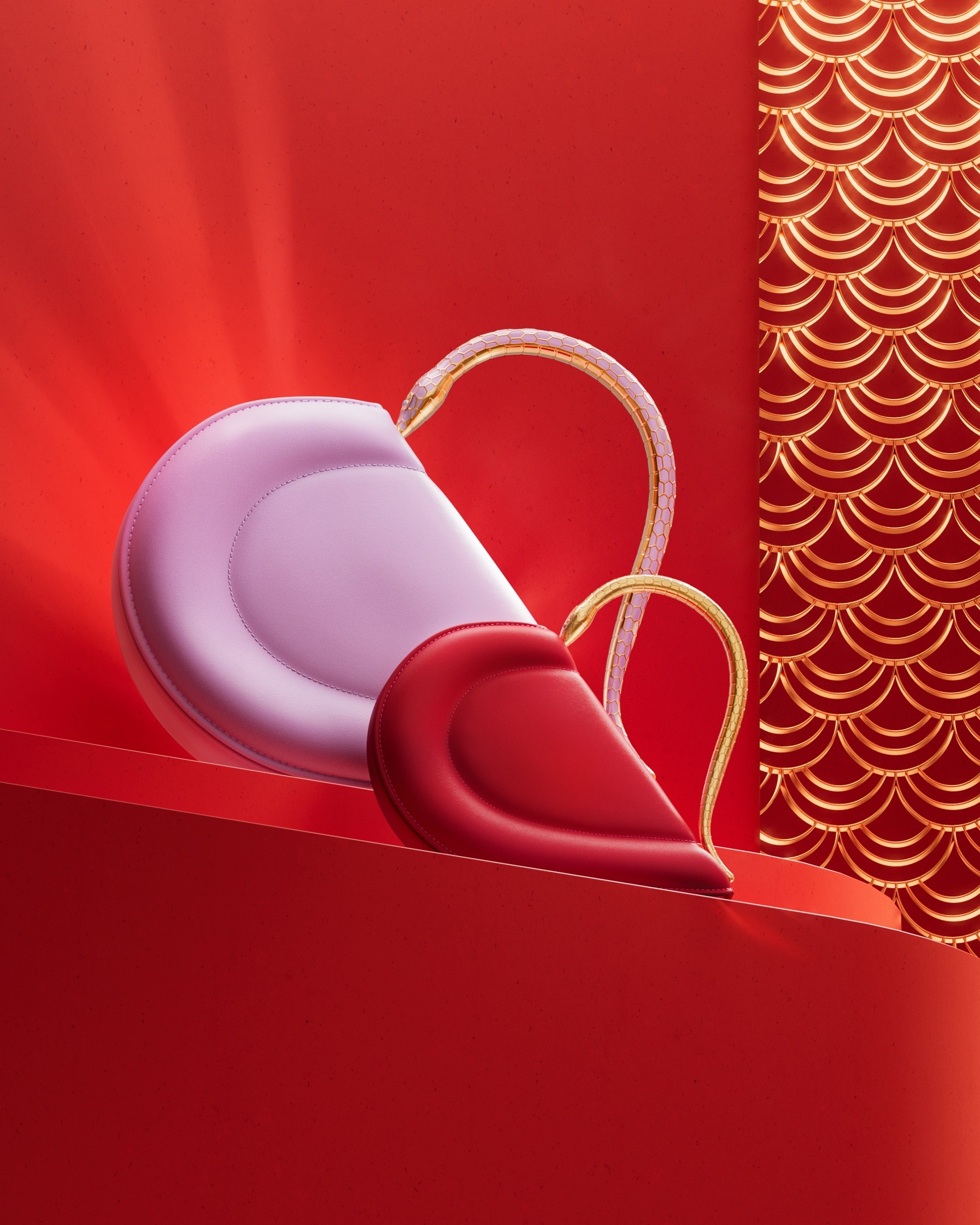 A seleção se completa com acessórios icônicos. A bolsa Serpenti Cuore 1968 retorna em couro na cor Ametista Clara, enquanto a Serpenti Cuoricino surge em versão mini nas cores Rubi Real e Rosa Claro. Ambas reforçam a presença do símbolo Serpenti como elemento central da narrativa visual da coleção.