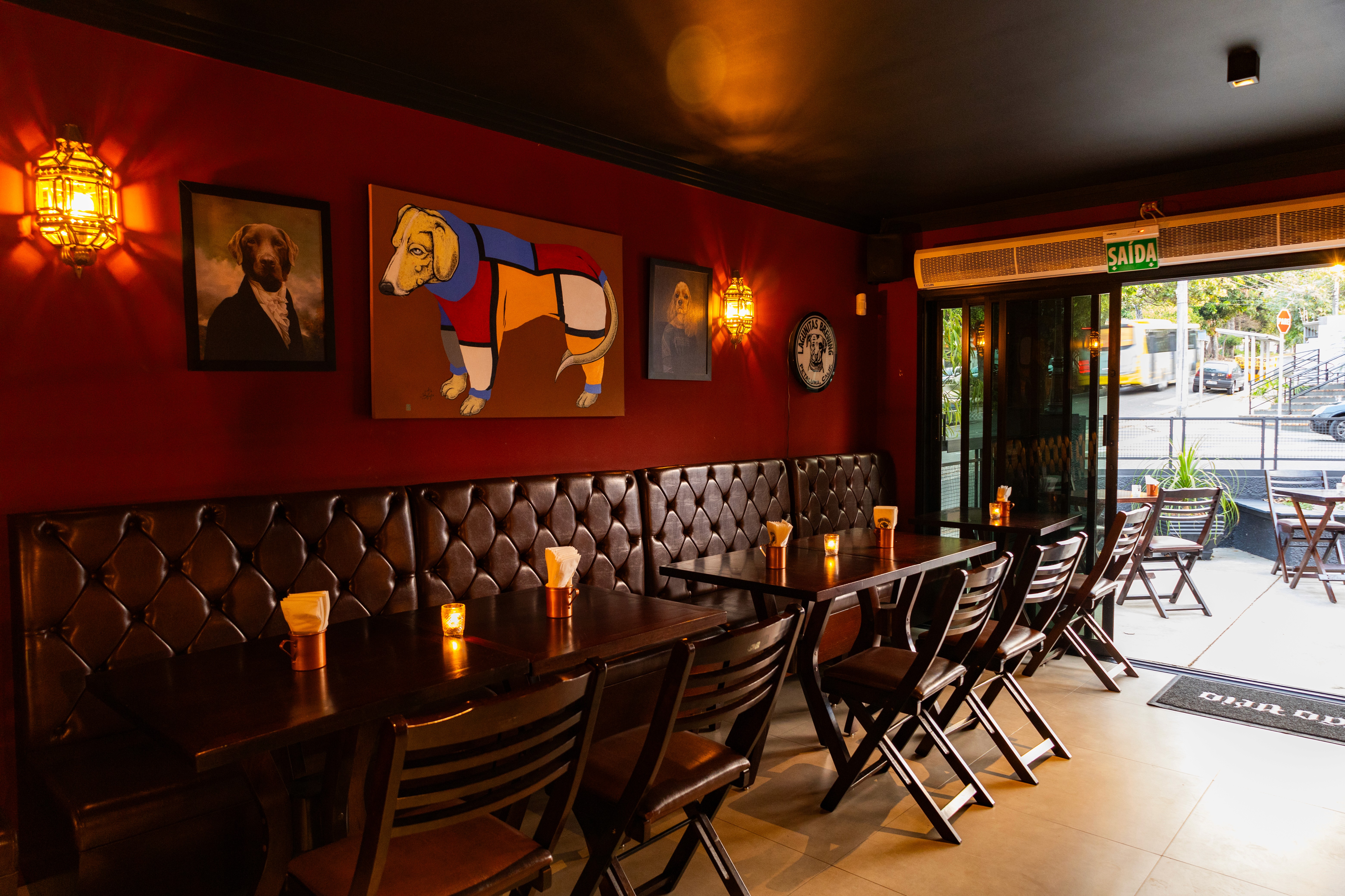 A ambientação combina referências de pubs londrinos com estética urbana. Iluminação baixa, paredes escuras, elementos em madeira e metal, além de objetos vintage, constroem um ambiente com linguagem própria. A presença de elementos gráficos ligados ao universo dos cães aparece em nomes de pratos e na identidade visual da casa.