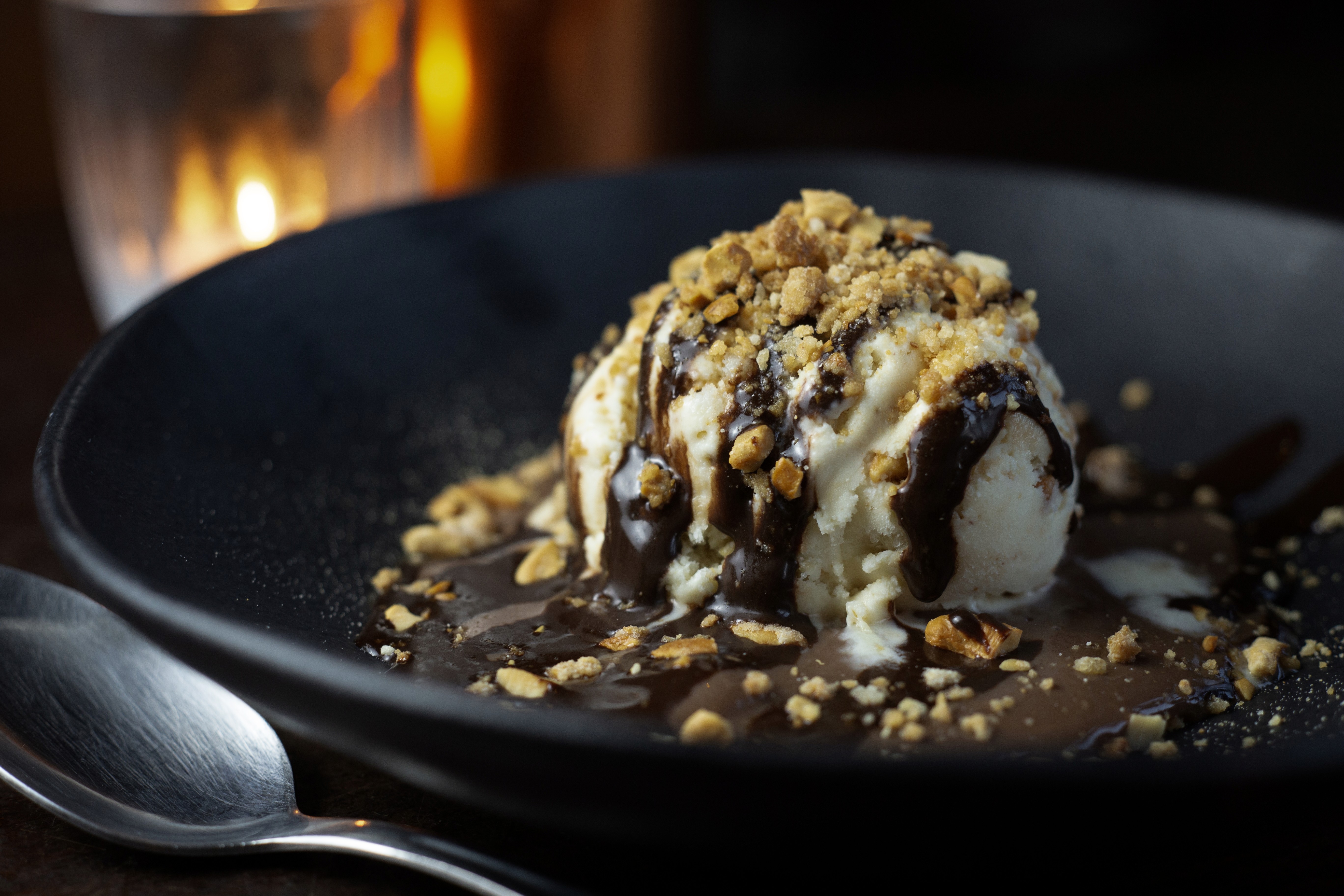 Na sobremesa, a Dama reúne sorvete artesanal de paçoca, brigadeiro, praliné de castanhas e calda de chocolate belga.
