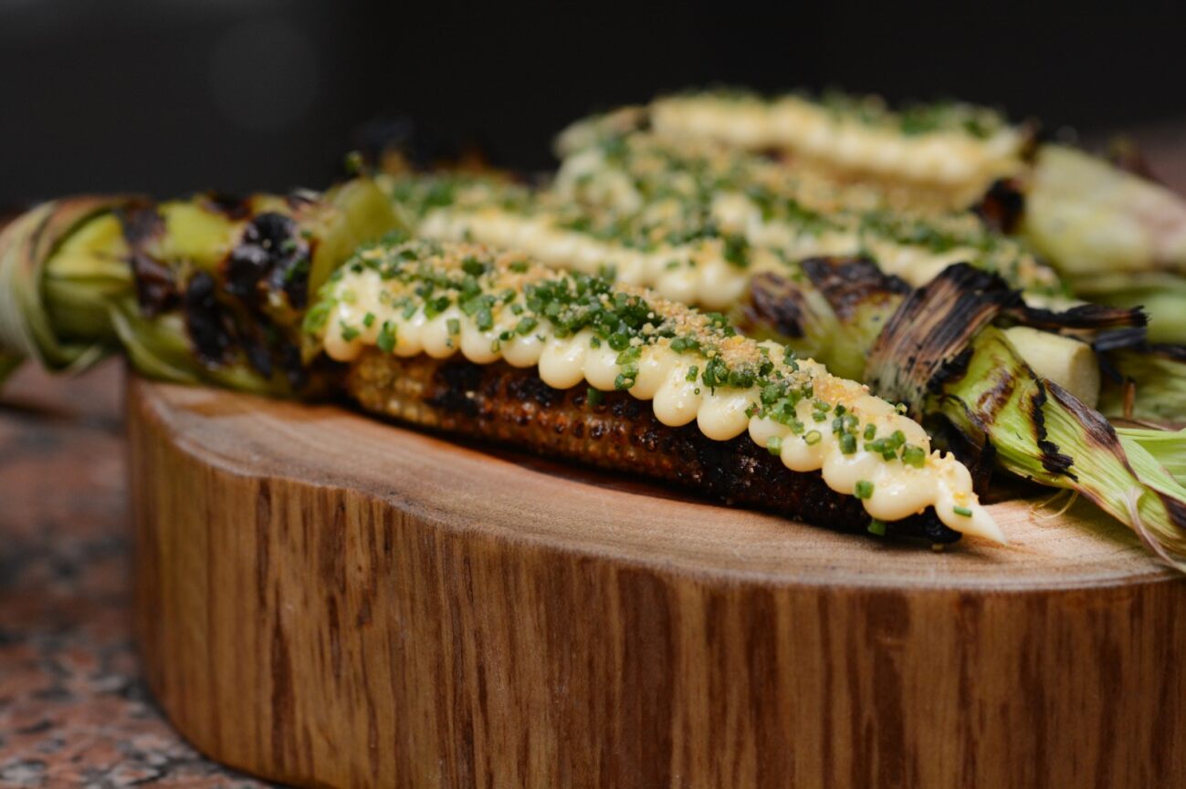 A organização do menu reflete essa estrutura, com seções dedicadas a Lenha, Brasa, Defumação e Proteínas, além dos acompanhamentos. Entre os pratos, aparecem preparações como broa de milho com manteiga defumada, milho jovem na brasa, peixe com caldo moquecado de camarão e arroz de cupim defumado.