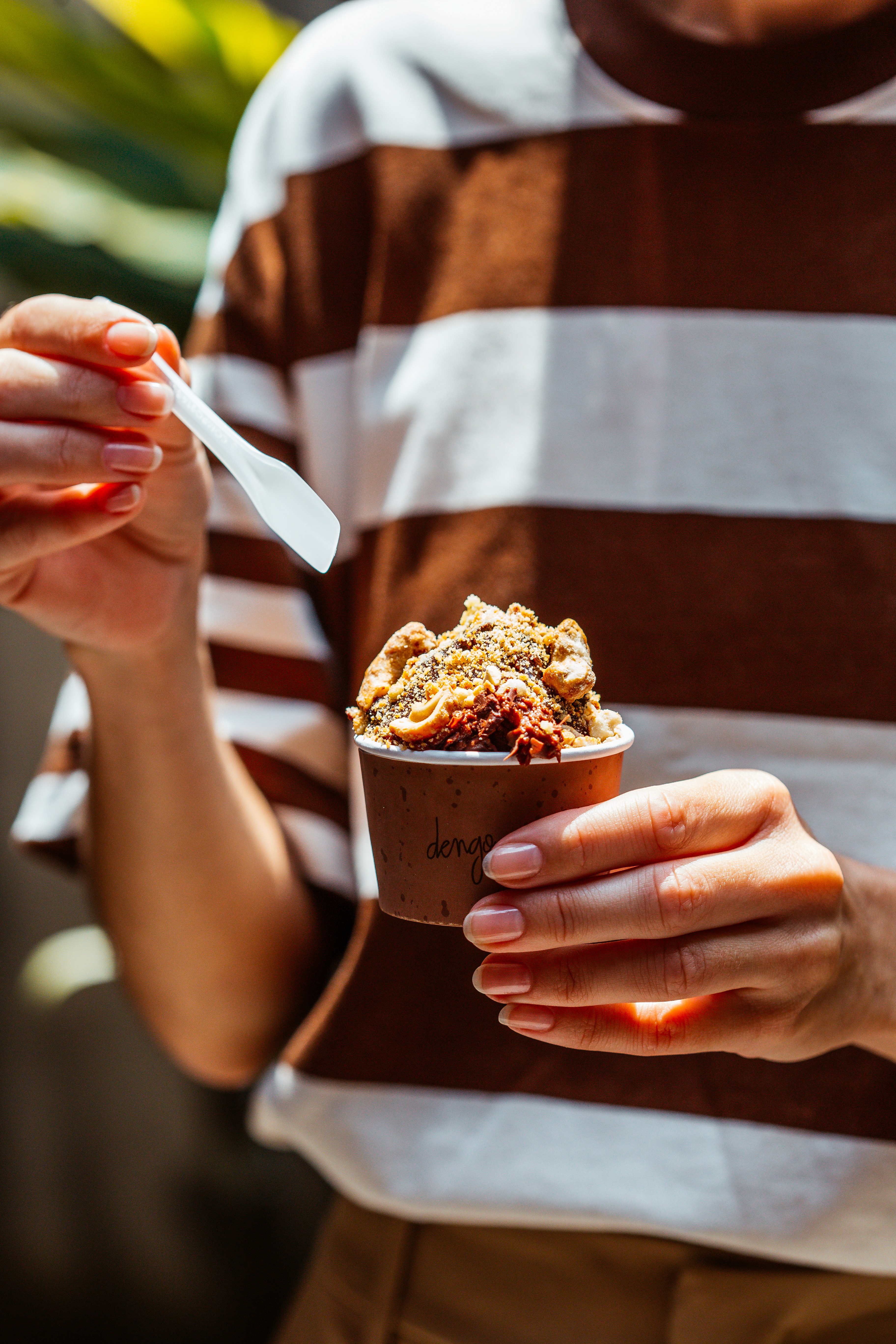 A experiência é complementada por toppings e caldas que adicionam contraste e textura. Entre os ingredientes estão crumble de banana, castanha-de-caju caramelizada, nibs de cacau, flor de sal, cupuaçu glaceado e crocante de tapioca. As caldas incluem chocolate, caramelo de cacau e caramelo de café. O cliente pode montar sua combinação ou optar por sugestões desenvolvidas pela casa.