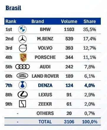 Os resultados iniciais da marca indicam crescimento no mercado automotivo premium no Brasil. Em fevereiro de 2026, a Denza registrou 124 unidades do modelo B5 licenciadas no país, alcançando a sétima posição no ranking nacional do segmento premium.