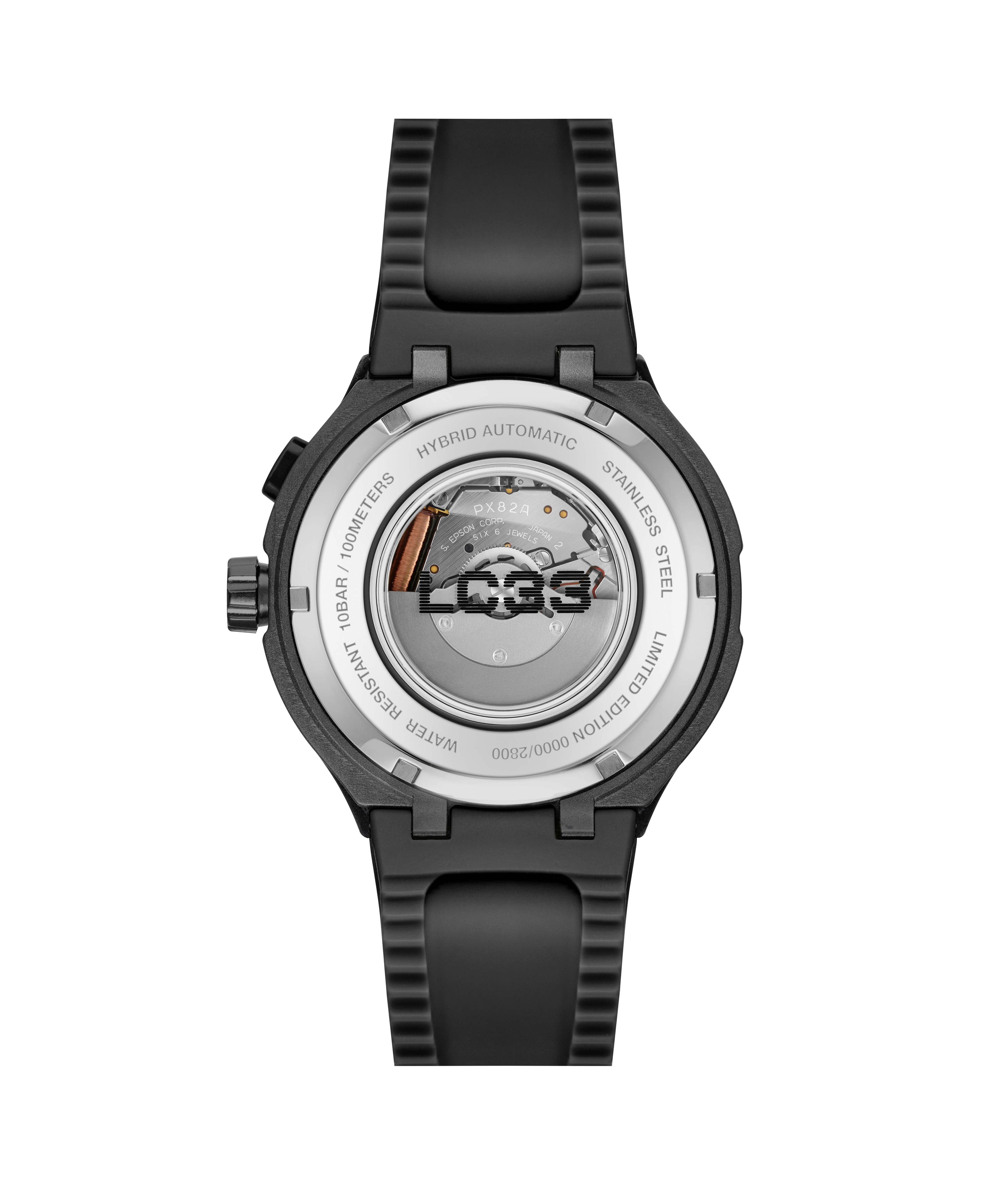 Disponível em três combinações de cores, o LC33 Hybrid apresenta caixa de 44 mm, bisel em TR90 preto e pulseira integrada de silicone com ajuste ao pulso. A proposta combina acabamentos polidos e foscos, criando contraste visual alinhado ao design contemporâneo.