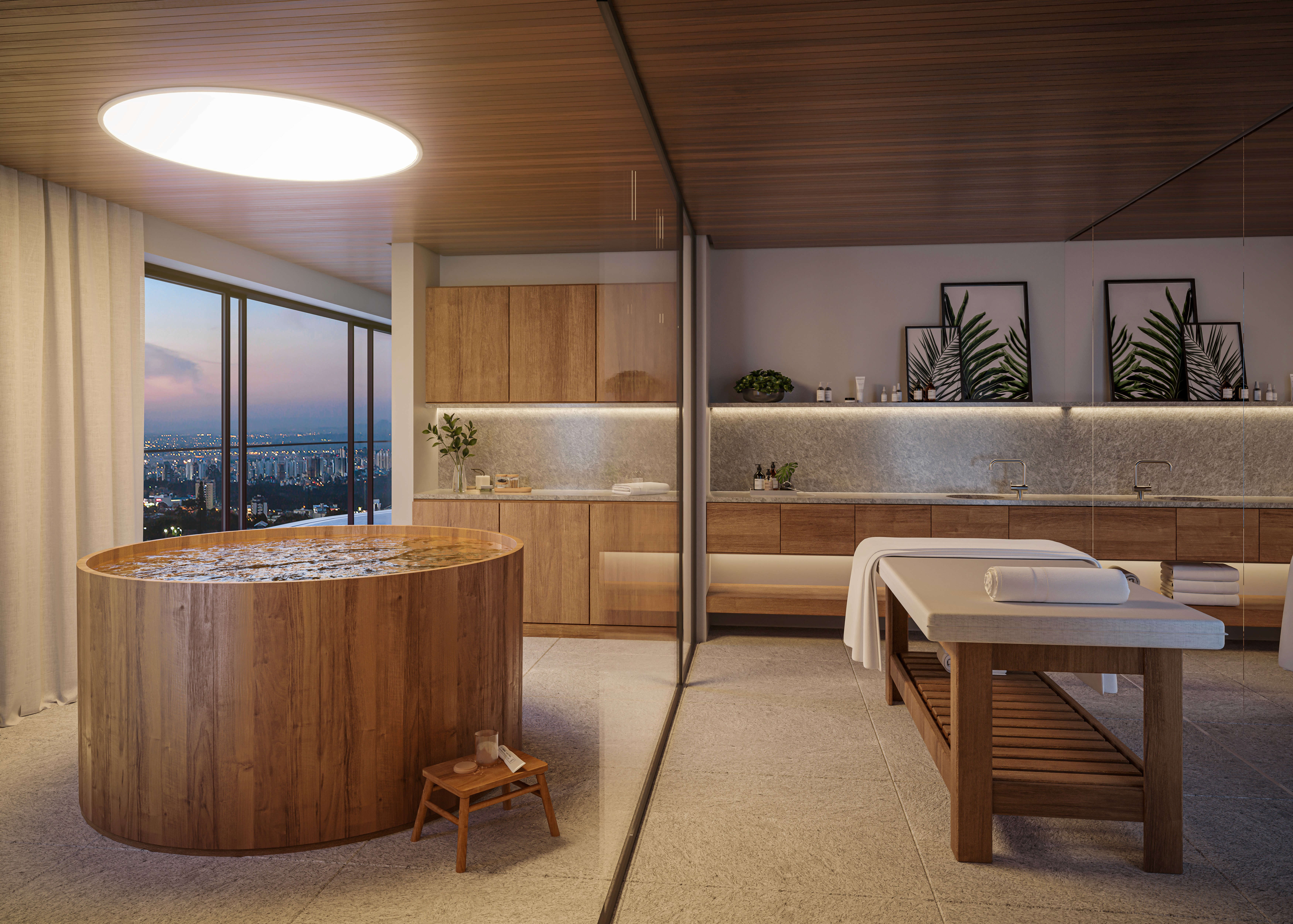 A presença de áreas biofílicas redefine o desenho dos projetos. Bosques privativos, paisagismo planejado, áreas de caminhada e fireplaces introduzem o conceito de oásis urbano, integrando natureza e arquitetura em um mesmo ambiente. Esses elementos contribuem para a qualidade de vida e impactam diretamente a percepção de valor.