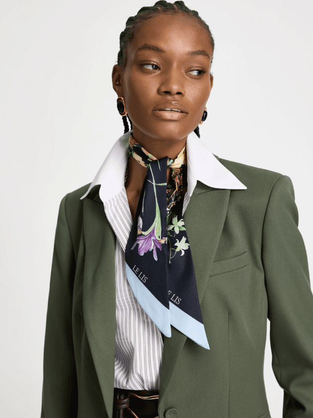O lenço volta ao radar fashion com uma proposta direta e funcional. Usado no pescoço como gravatinha, o acessório se posiciona como recurso de styling capaz de transformar produções com poucos elementos. A combinação entre referências francesas, alfaiataria contemporânea e feminilidade reposiciona o item no guarda-roupa atual.