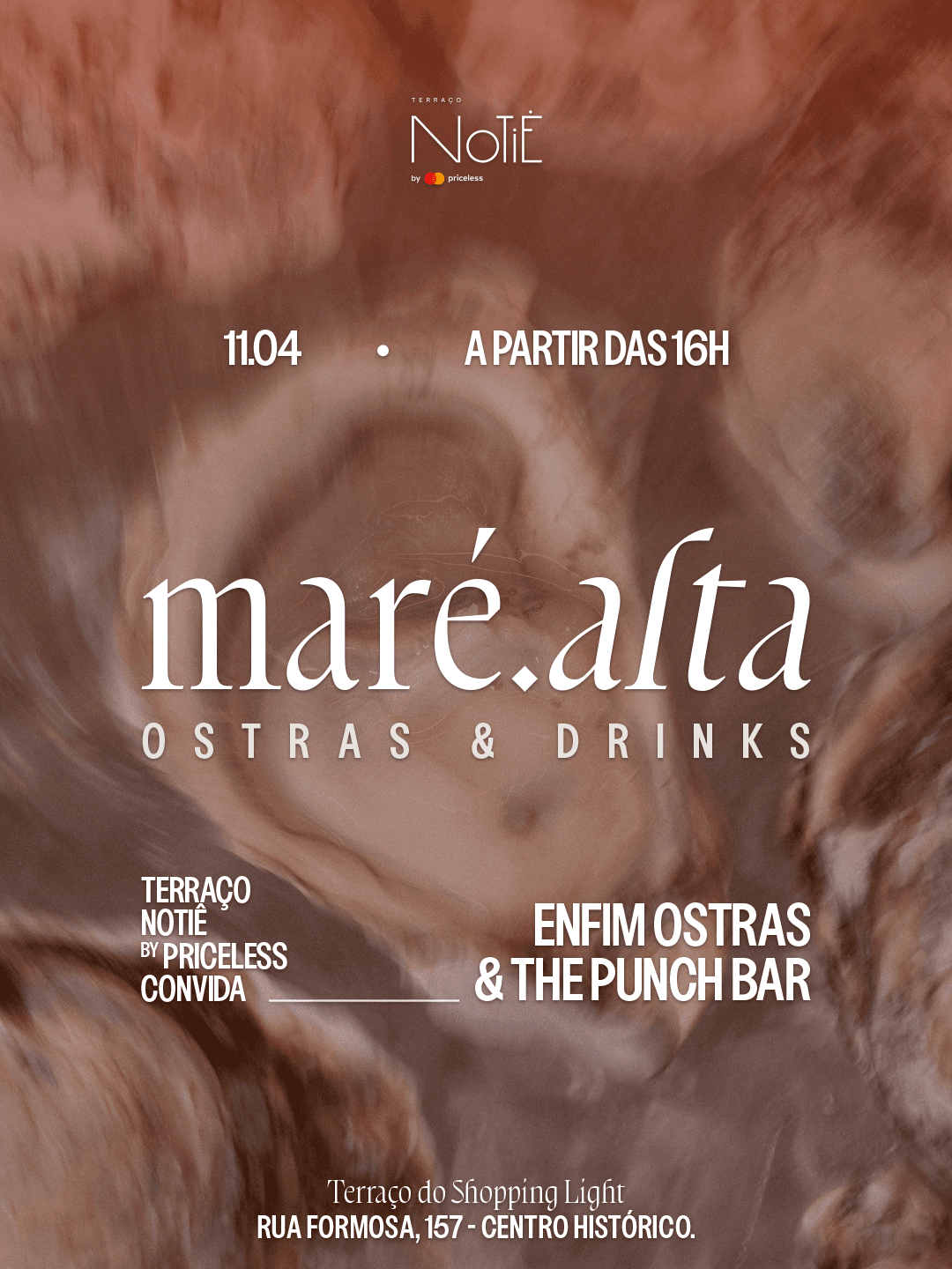 O Terraço Notiê by Priceless apresenta a Maré Alta, uma experiência criada em parceria com a Enfim Ostras, que acontece nos dias 11 e 26 de abril, a partir das 16h. A proposta conecta gastronomia, coquetelaria e música em um ambiente com vista para o centro histórico de São Paulo.