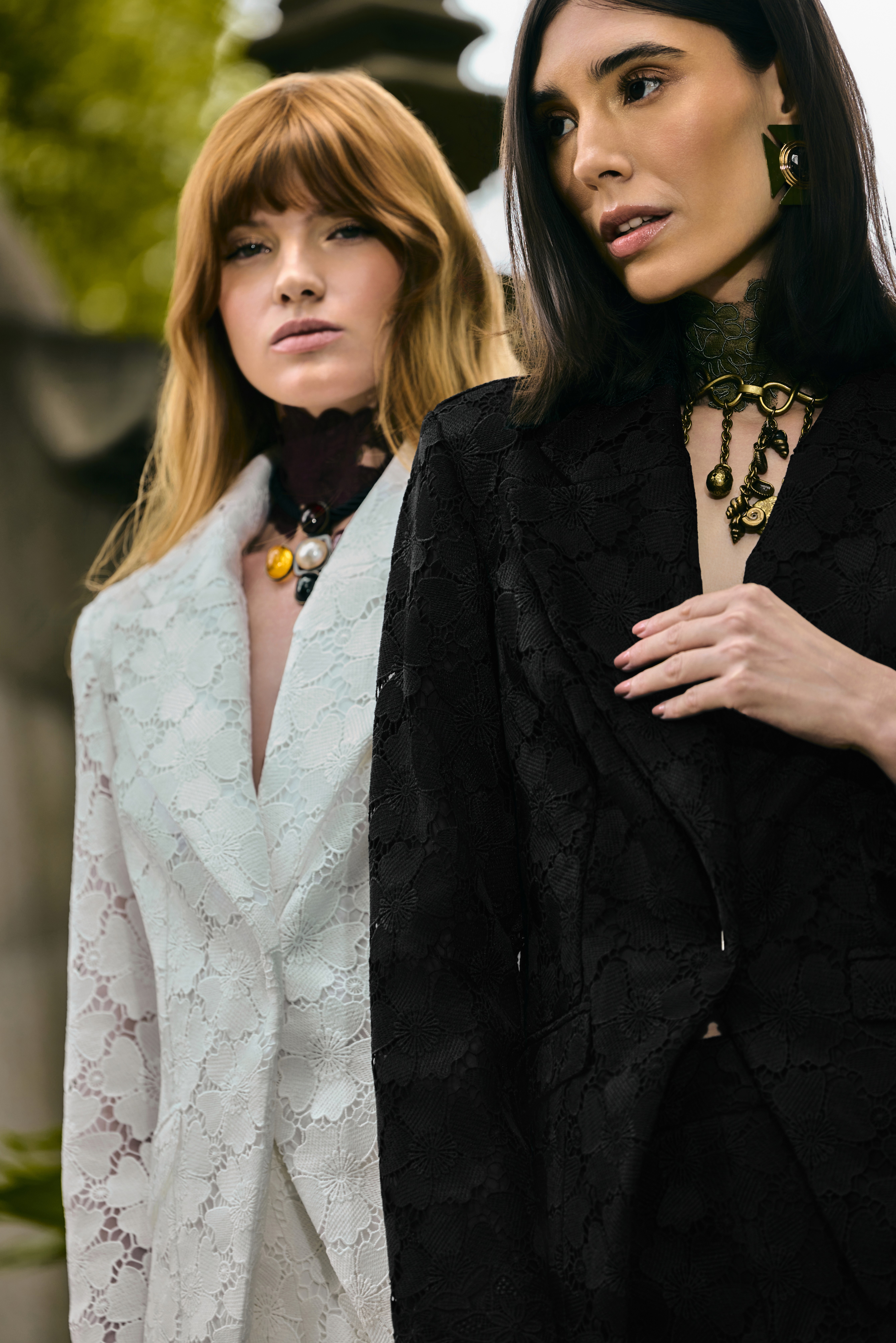 Rendas e tafetá conduzem a narrativa em vestidos longos e midi, com estampas florais estilizadas e psicodélicas reinterpretadas para o universo da marca. Modelos com mangas bispo e silhuetas que valorizam movimento ampliam a proposta. A renda francesa surge em faixas verticais e golas altas, criando sobreposições e novas construções visuais.