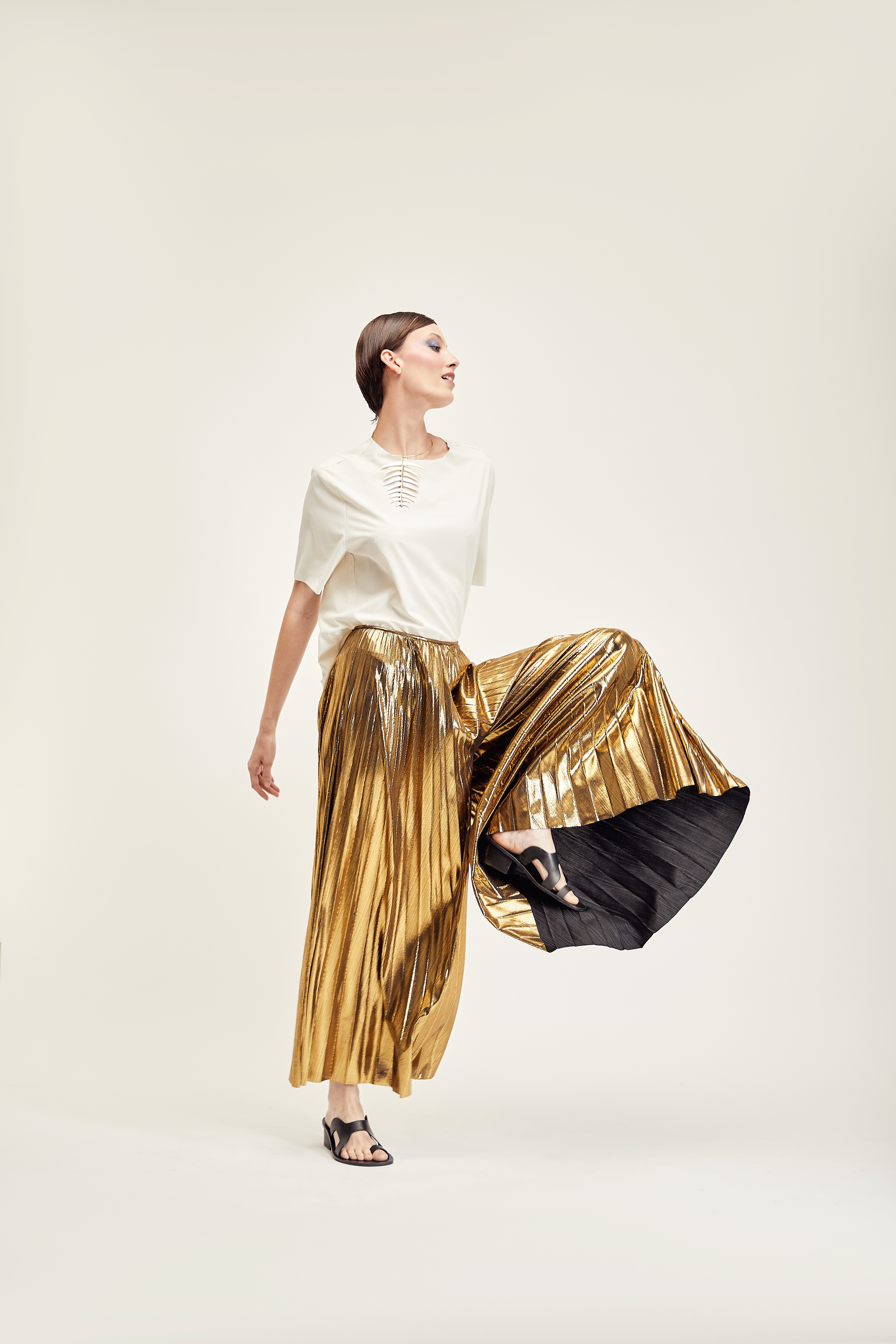Criada especialmente para a temporada, a coleção reúne dez peças que refletem o espírito da folia. Entre os destaques estão o tênis Samba e a bolsa mini Andiroba, desenvolvidos em couro com efeito metalizado furta-cor. A proposta se completa com vestido e calça com aplicação de foil dourado em tecido plissado, formando um desenho que remete ao leque.