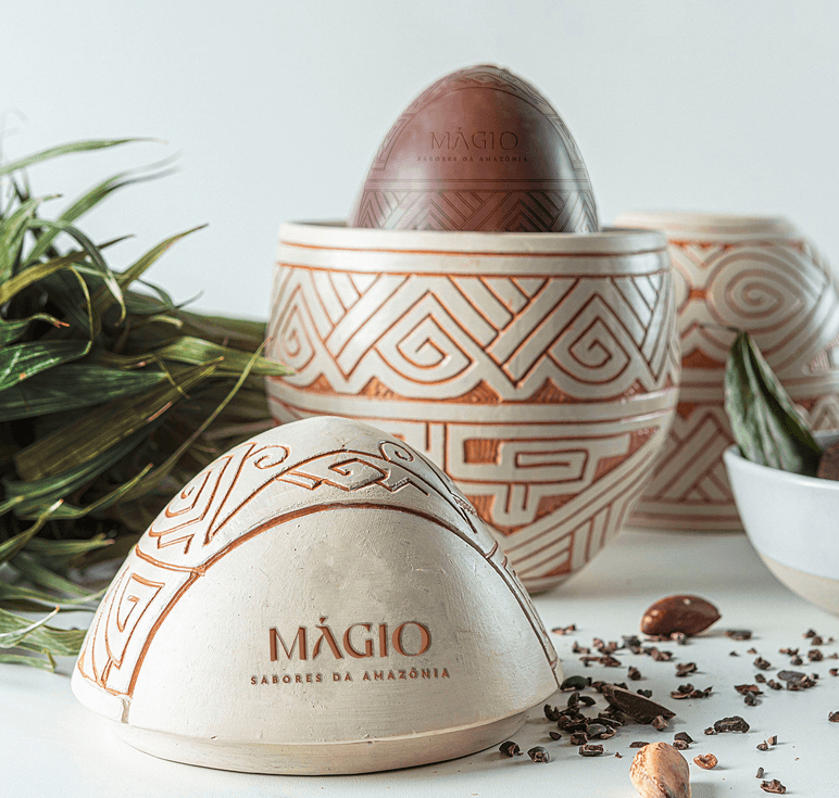 Além do chocolate, a coleção incorpora elementos de design e produção artesanal. Cada ovo é acompanhado por uma peça de cerâmica desenvolvida pelo oleiro Carlos Pantoja, com referências aos grafismos marajoara e tapajônico. A escolha amplia a proposta do produto ao integrar cultura material e identidade regional.
