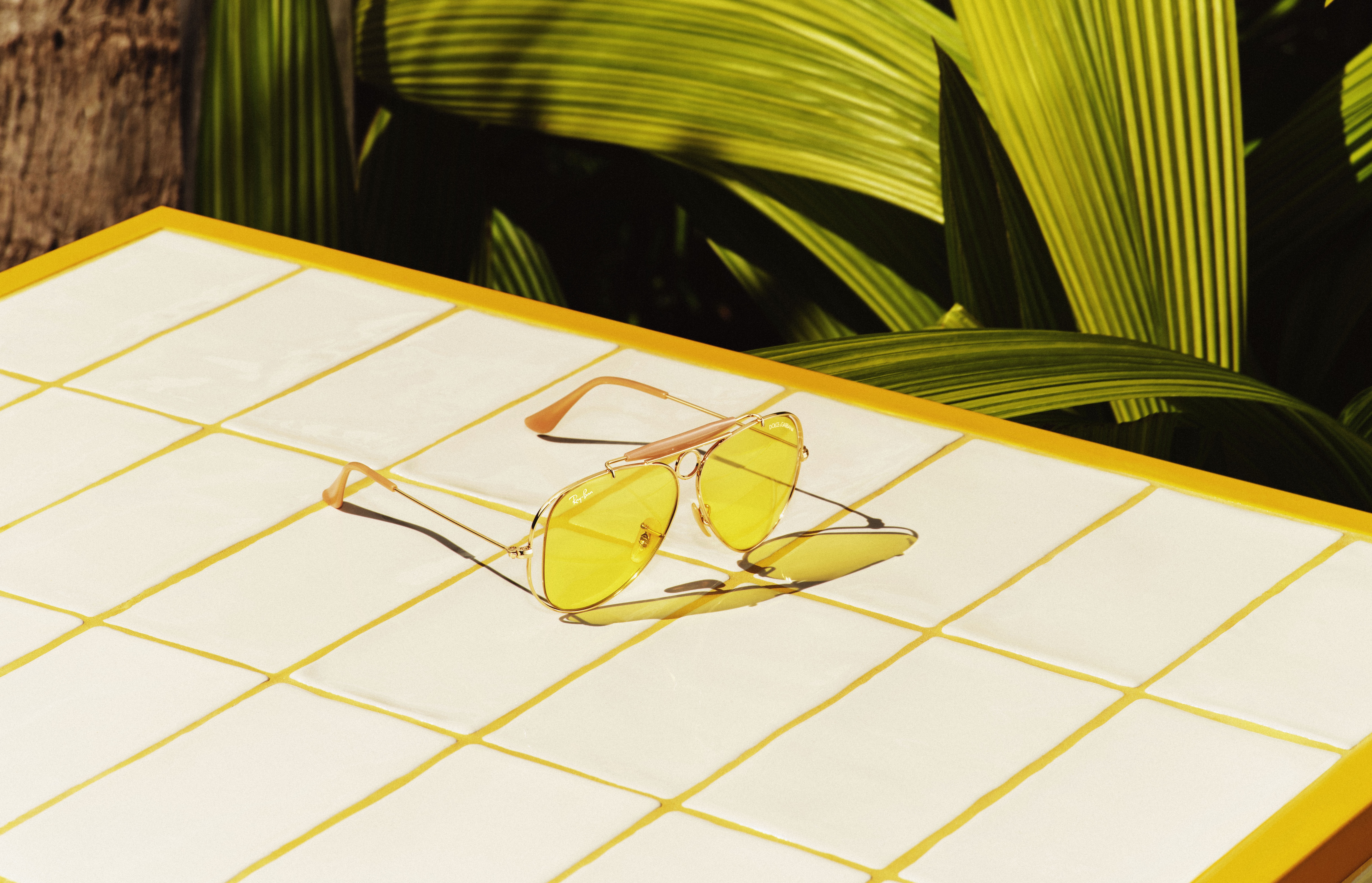 O projeto revisita os modelos Shooter e Outdoorsman II a partir de referências do acervo da Ray-Ban. O Shooter apresenta barra superior em madrepérola e suporte circular integrado, mantendo a estrutura metálica fina e sem aro. As lentes em formato de gota aparecem em cores como laranja, rosa, verde, azul e amarelo, em versões transparentes e espelhadas, com assinatura das duas marcas.