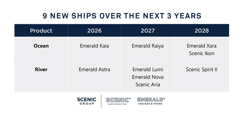 O Scenic Group anunciou a construção de três novas embarcações que irão ampliar sua frota fluvial entre 2027 e 2028. O plano inclui dois novos Scenic Space-Ships e um Emerald Star-Ship, destinados a rotas na Europa e no Sudeste Asiático.
