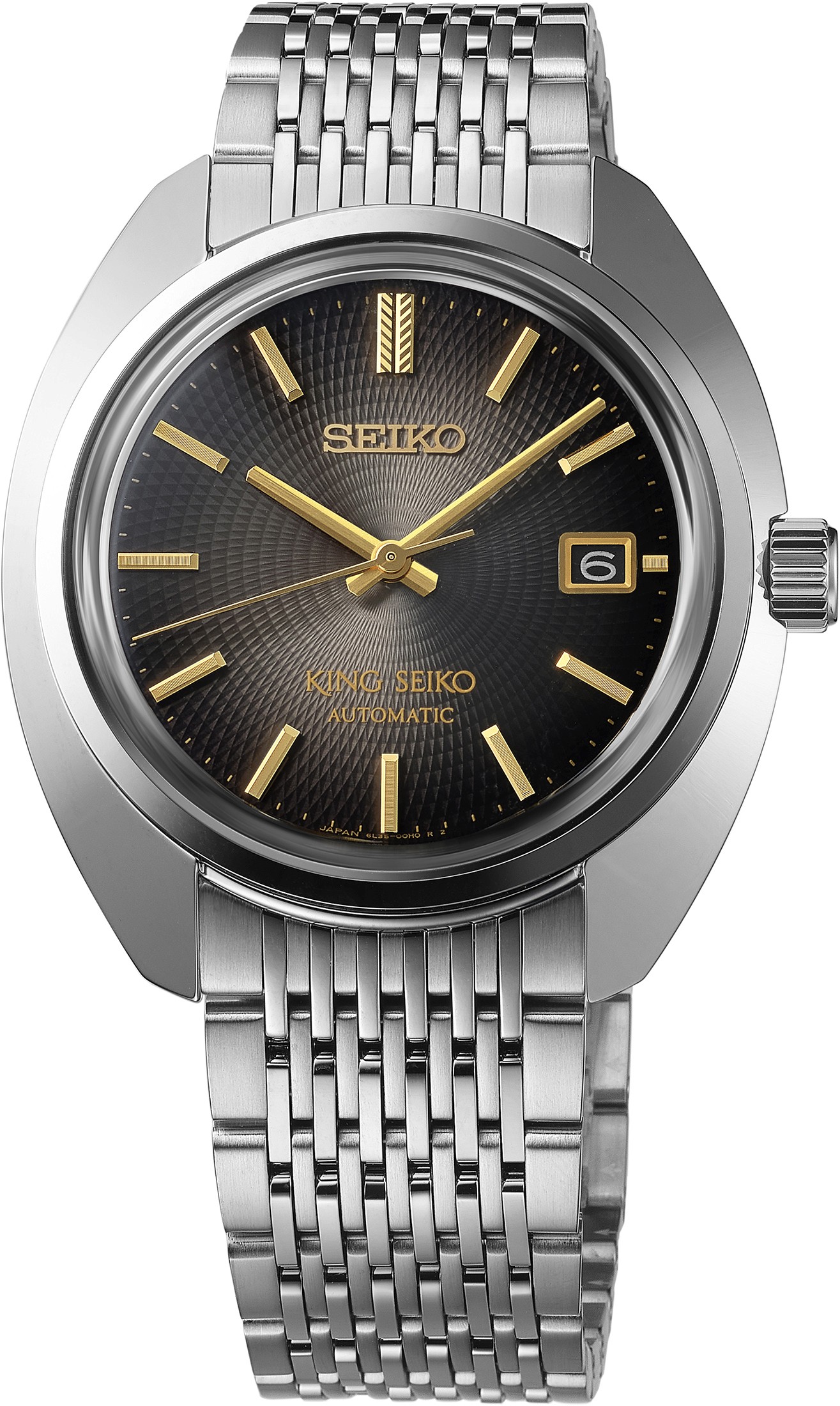 A linha King Seiko revisita o design japonês dos anos 1960 com uma leitura contemporânea. O modelo apresenta caixa angular, mostrador com padrão inspirado em gravuras históricas e acabamento com degradê acinzentado. O calibre mecânico ultrafino integra a série KS1969 e reforça a identidade da linha.
