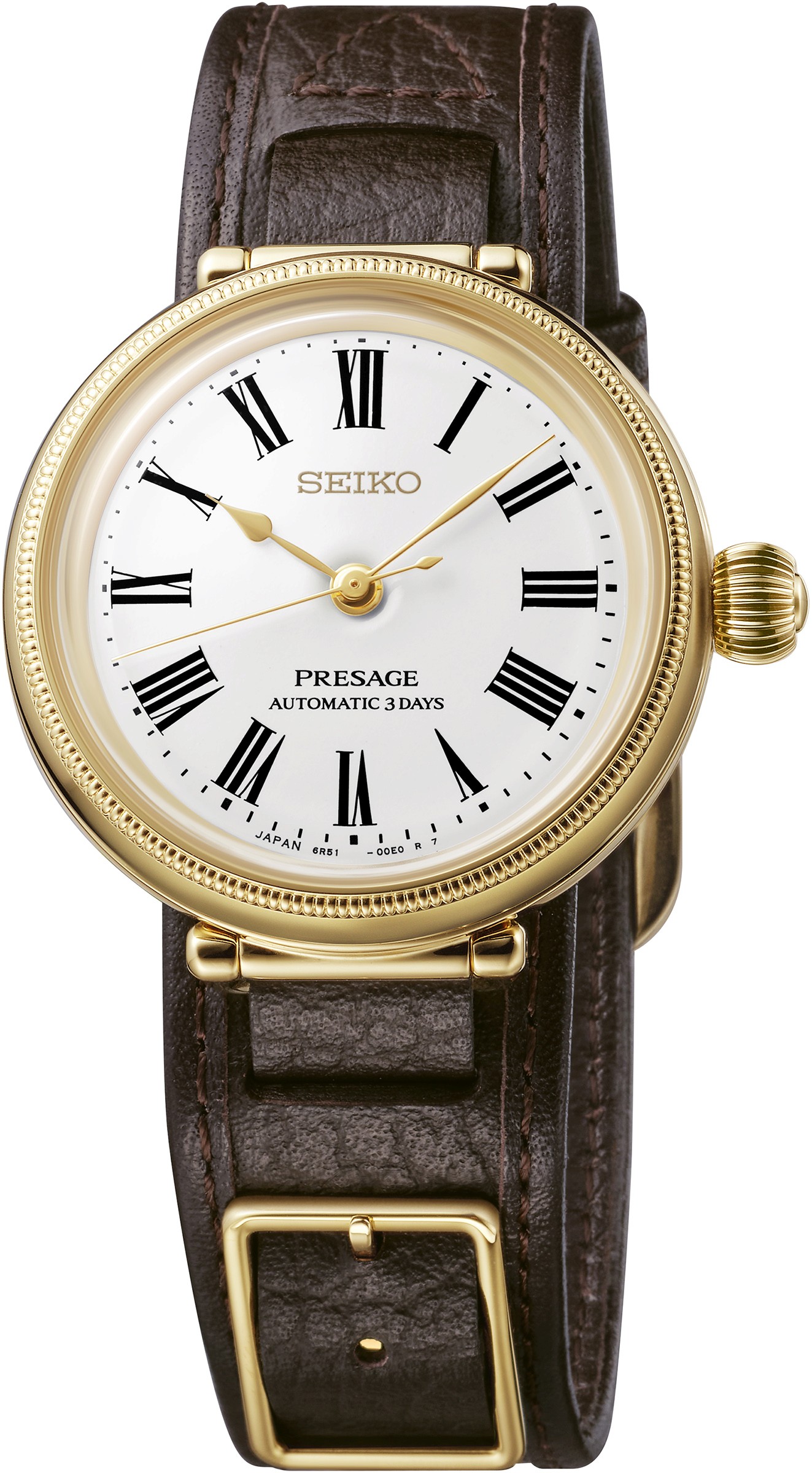 No Presage, a proposta conecta relojoaria mecânica à cultura japonesa. Inspirado no relógio de bolso Timekeeper, o modelo traz mostrador em esmalte branco, numerais romanos e vidro em formato box. A peça também incorpora pulseira em couro certificado pela Leather Working Group e reserva de marcha de até três dias.