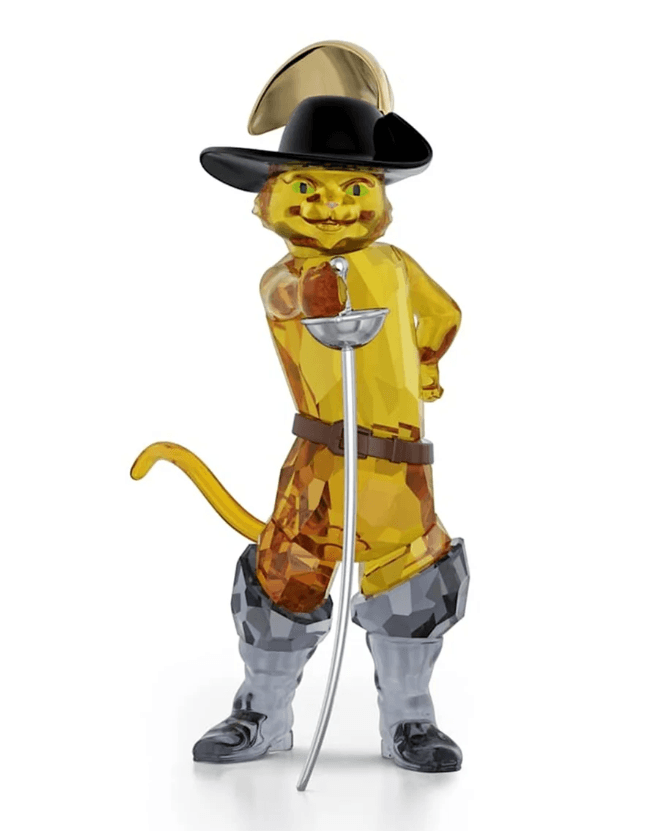O Gato de Botas aparece com chapéu e espada em metal laqueado cinza-escuro, composto por 296 facetas.