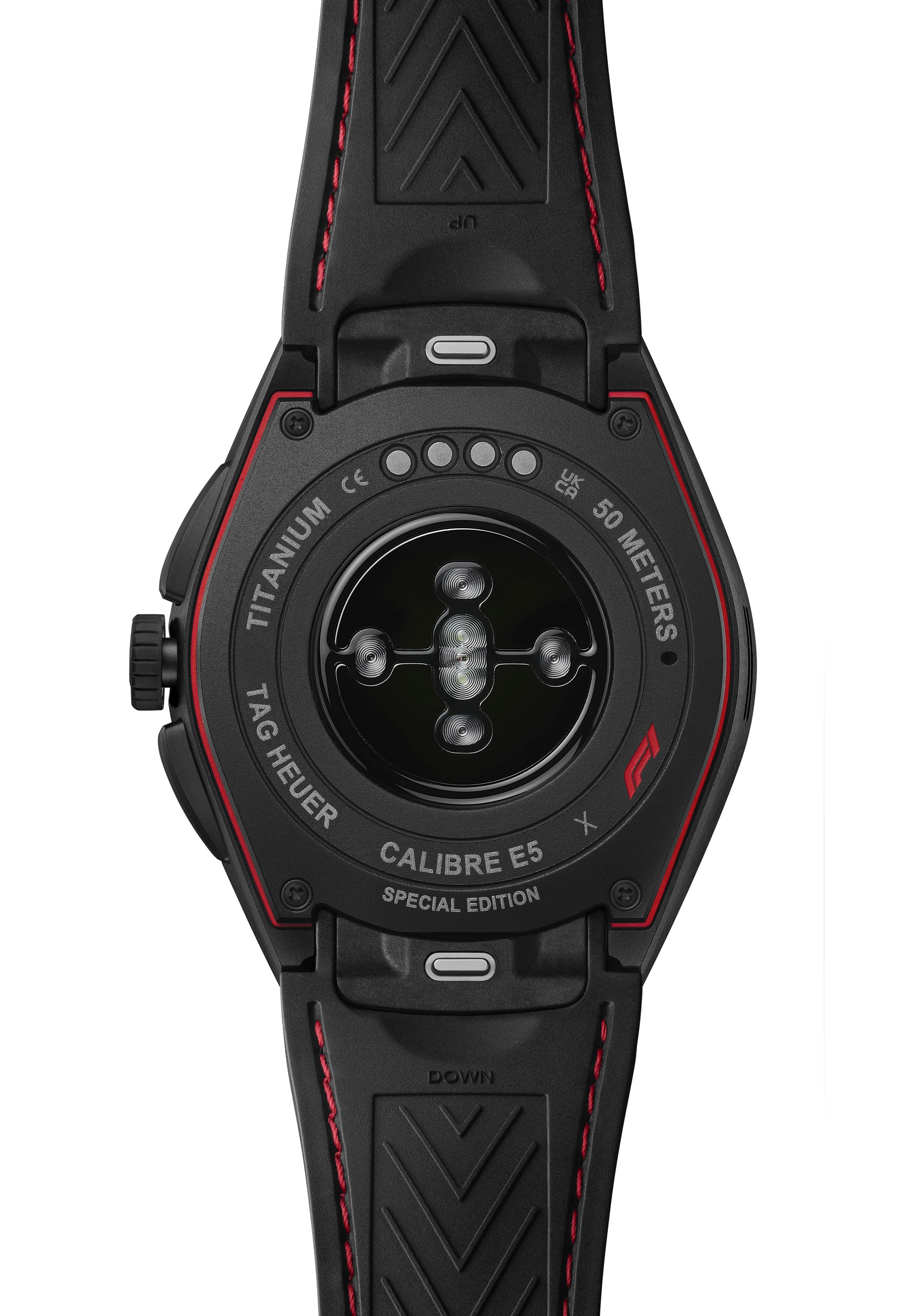 A caixa de 45 mm é produzida em titânio grau 2 com revestimento DLC preto, bezel em cerâmica com gravações das fases do fim de semana de corrida e cristal de safira plano. O fundo da caixa traz o logotipo vermelho da Formula 1 e sensor PPG integrado.