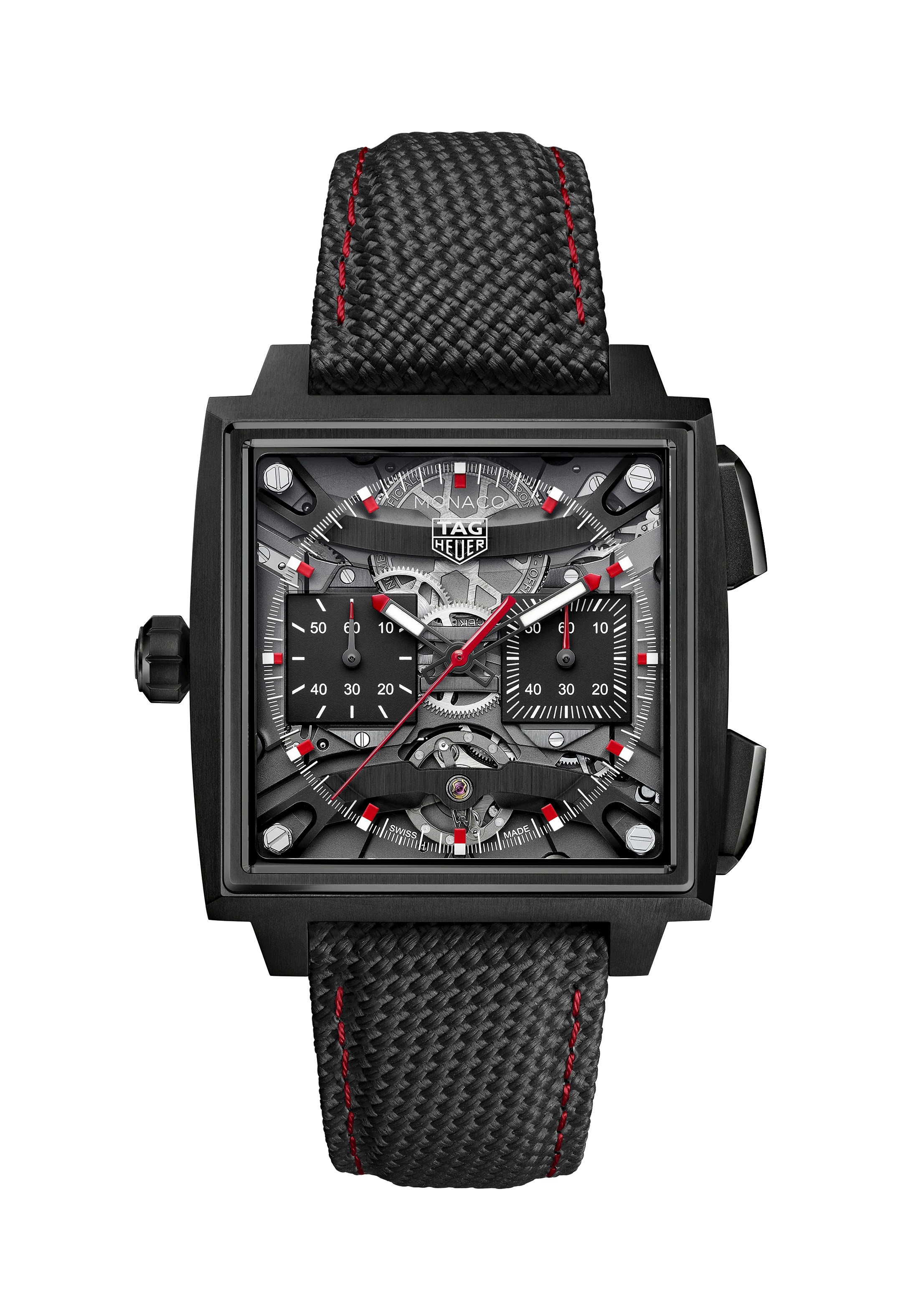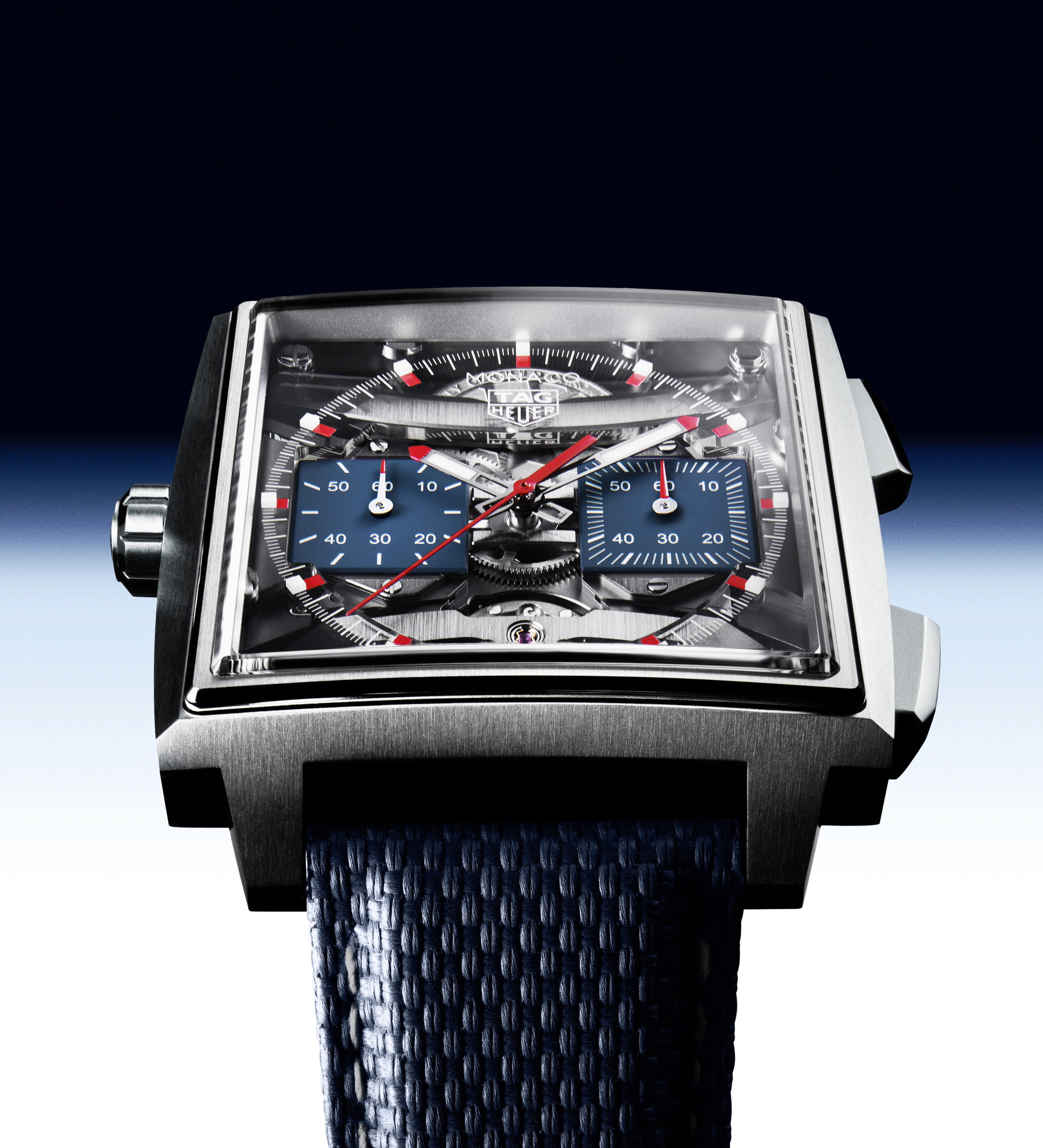 O modelo mantém a identidade do Monaco lançado em 1969, com caixa quadrada e coroa posicionada à esquerda. A nova versão apresenta caixa de 40 mm em titânio grau 5, fundo em safira e design mais ergonômico. O mostrador transparente cria a sensação de elementos suspensos, enquanto a estrutura reforça a integração entre movimento e caixa.