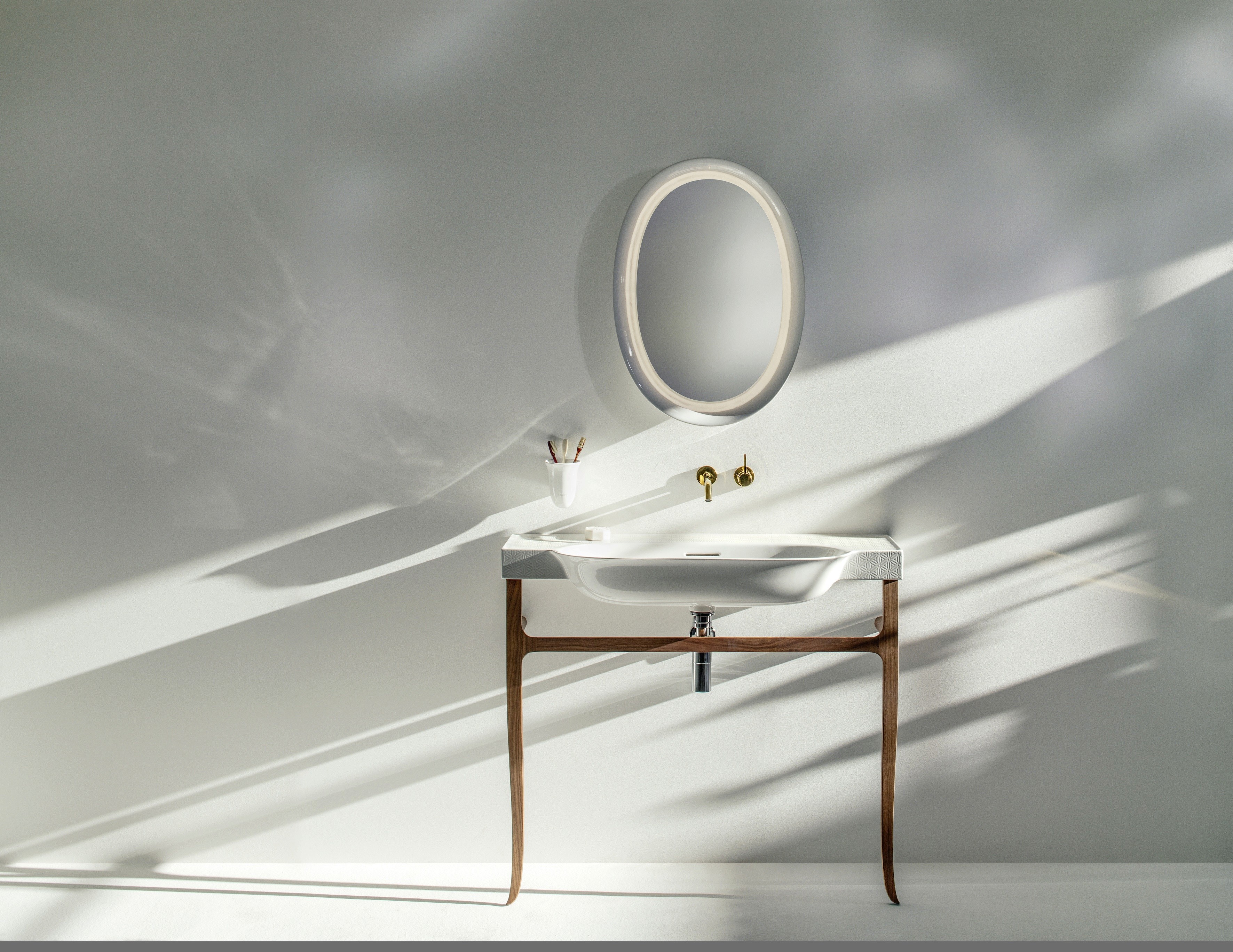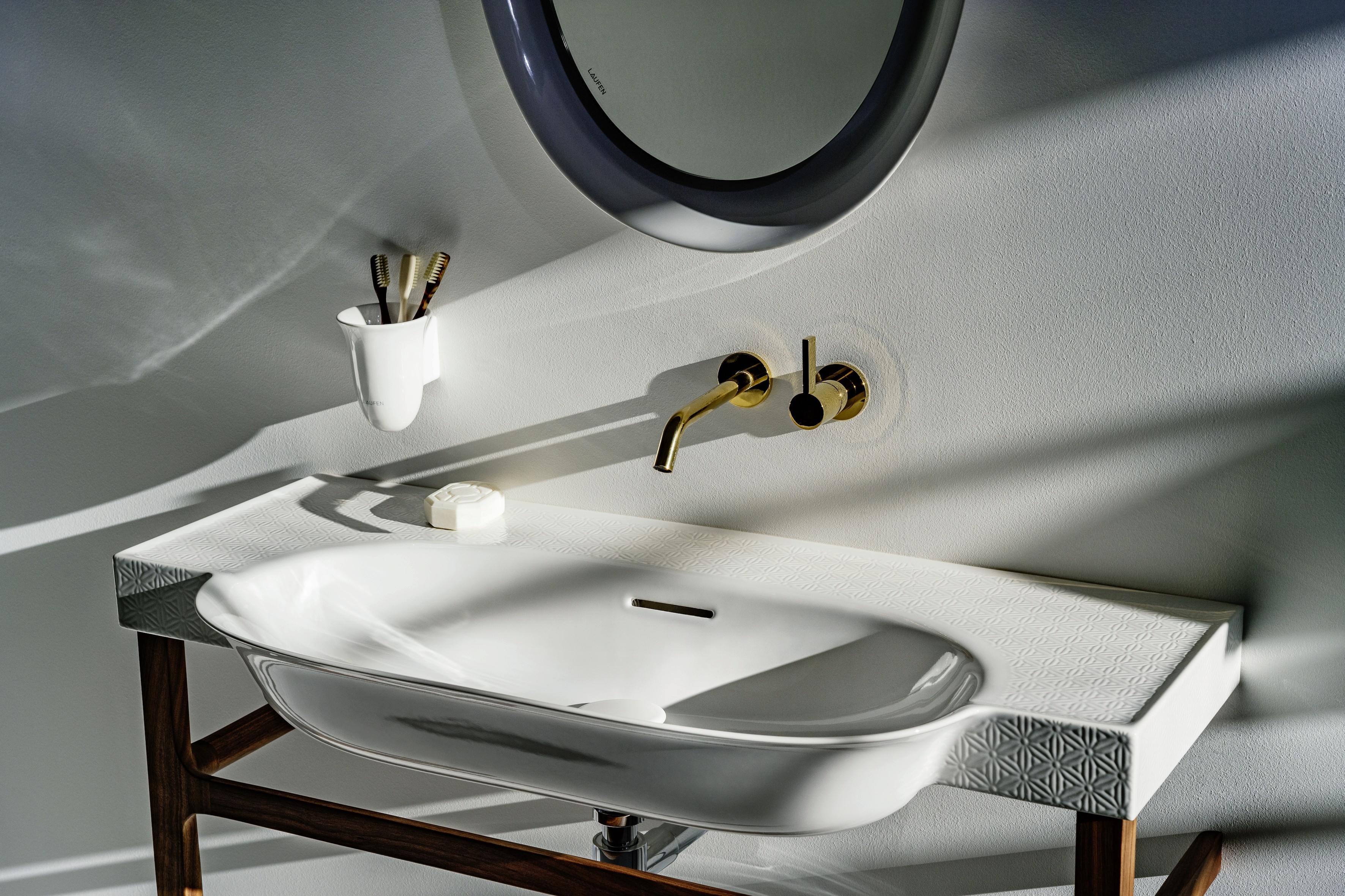 O desenvolvimento estético da coleção conta com a participação do designer holandês Marcel Wanders, que explorou o potencial da tecnologia Saphirkeramik, material pelo qual a LAUFEN é reconhecida.