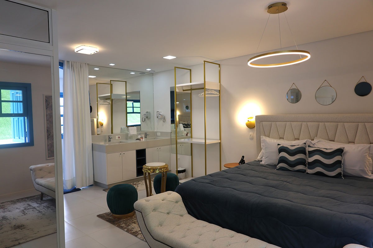 Além da proposta temática, as acomodações foram projetadas para oferecer espaços amplos, áreas de descanso e vista para os jardins e para a paisagem da serra.