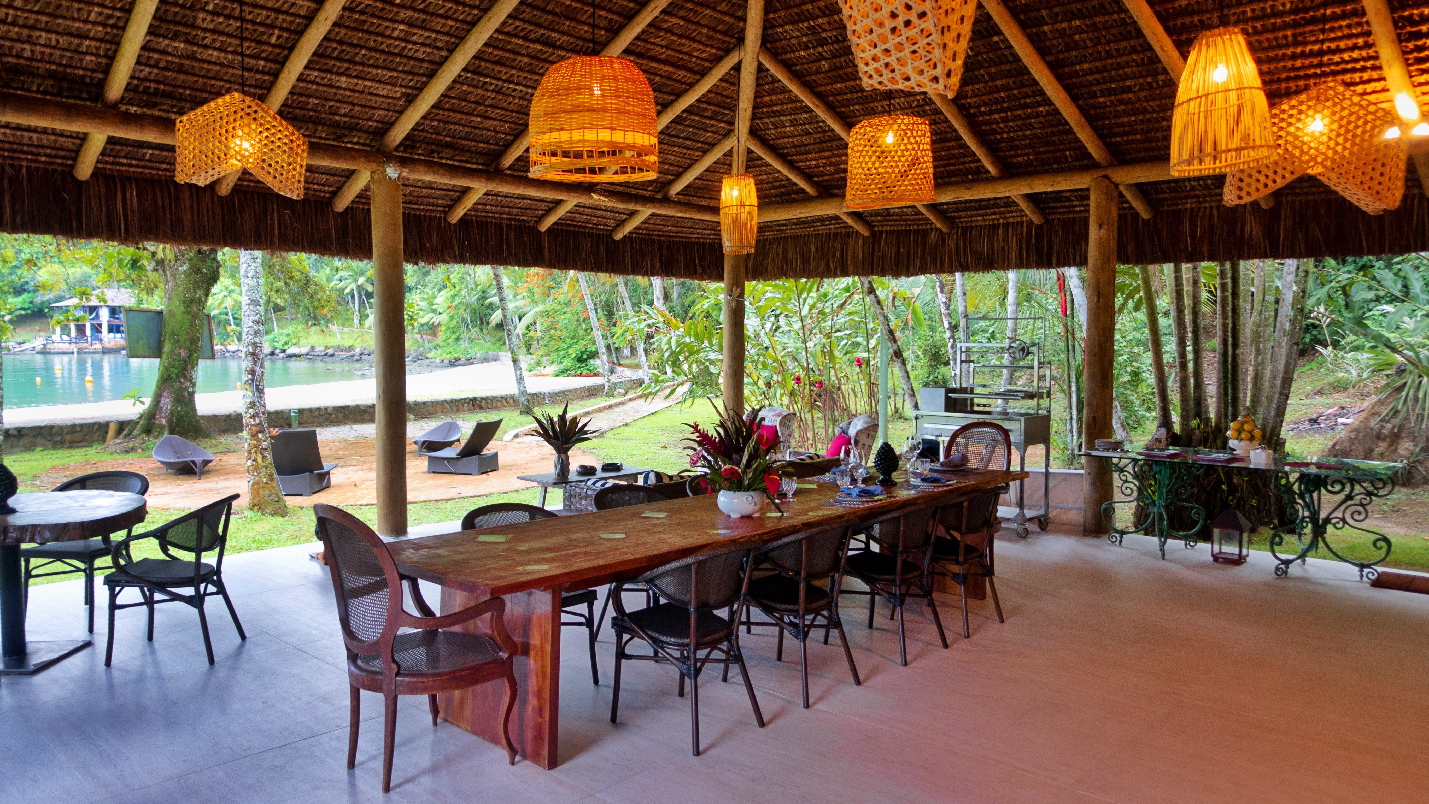 Inserida em um jardim privativo de trinta mil metros quadrados, com seis suítes voltadas para o mar, a villa passa a valorizar ainda mais os espaços abertos. O novo quiosque foi construído em madeira e palha natural, com aberturas amplas e vista permanente para a baía.