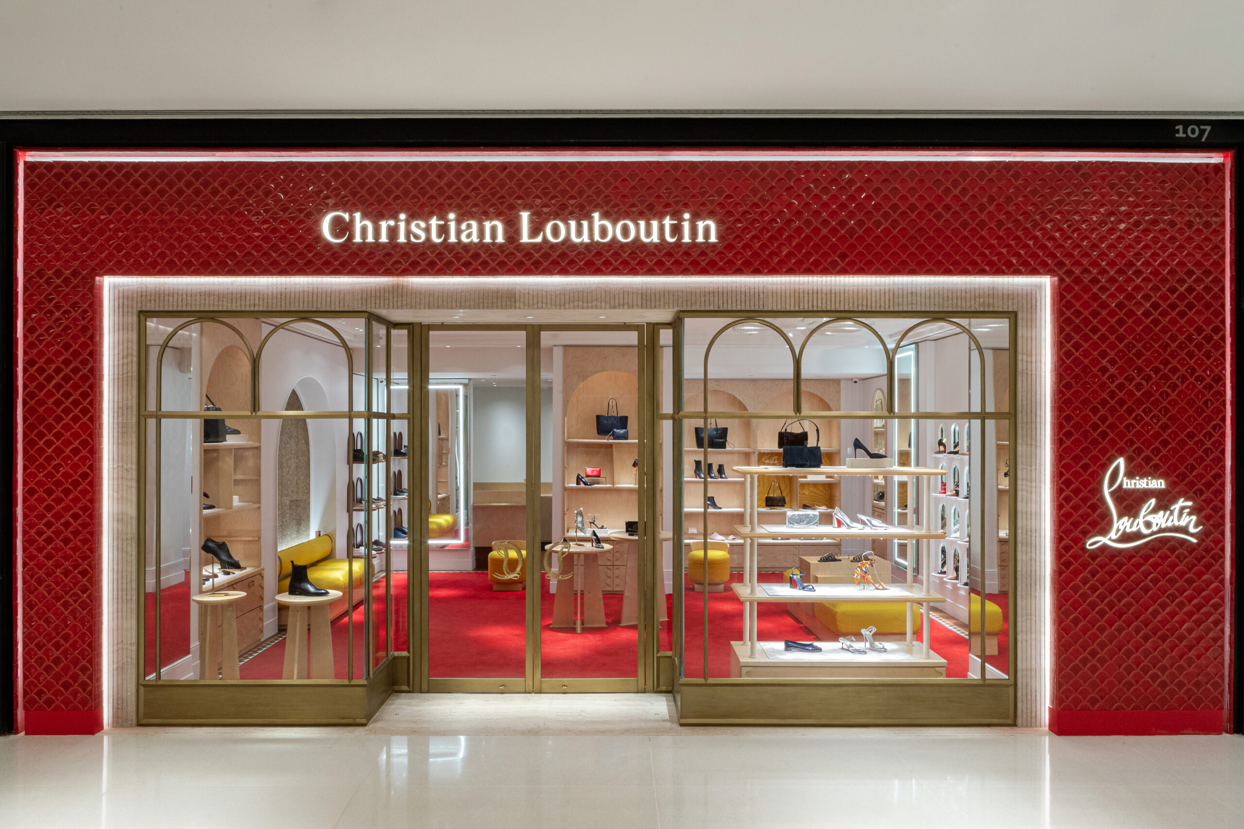 Refletindo o acolhimento íntimo da residência pessoal de Louboutin, o espaço é cuidadosamente dividido em dois ambientes distintos: um lounge iluminado para o dia e uma sala de estar convidativa para a noite. Essa dualidade encarna a visão de Christian Louboutin de uma boutique que se aproxima menos do varejo tradicional e mais da experiência de entrar na casa acolhedora de um amigo querido. Em homenagem aos códigos icônicos da Maison, os visitantes são recebidos pelo tapete vermelho característico, convidando-os a entrar em um mundo de elegância e sofisticação.