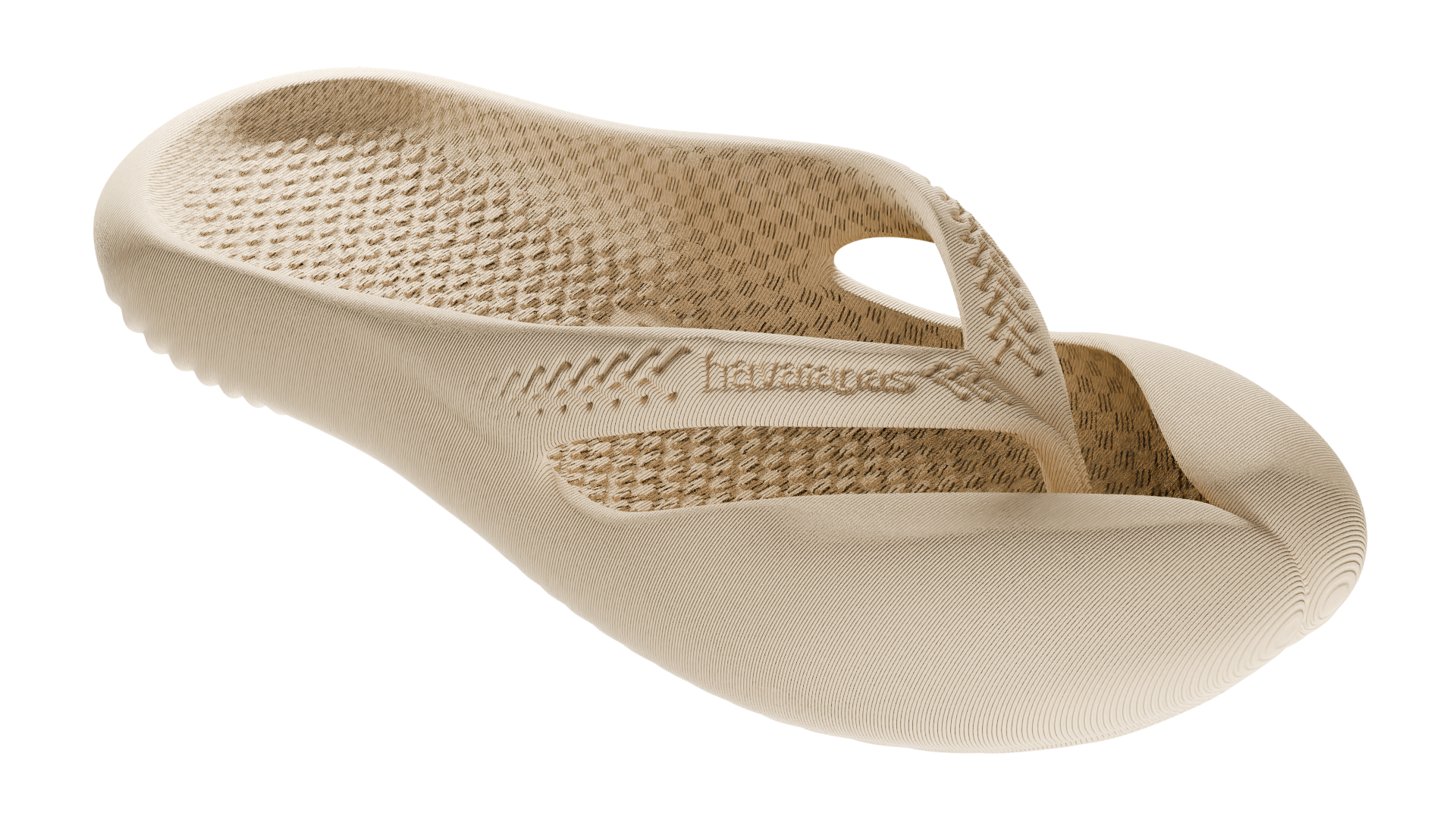 Com design futurista e fiel à essência da Havaianas Top, o calçado traz proporções clássicas, logo em destaque e solado anatômico em formato mais orgânico. Feito 100% em TPU por meio da tecnologia FDM (Fused Deposition Modeling), cada par é impresso em camadas sem uso de cola ou costura — totalmente reciclável e sob demanda.