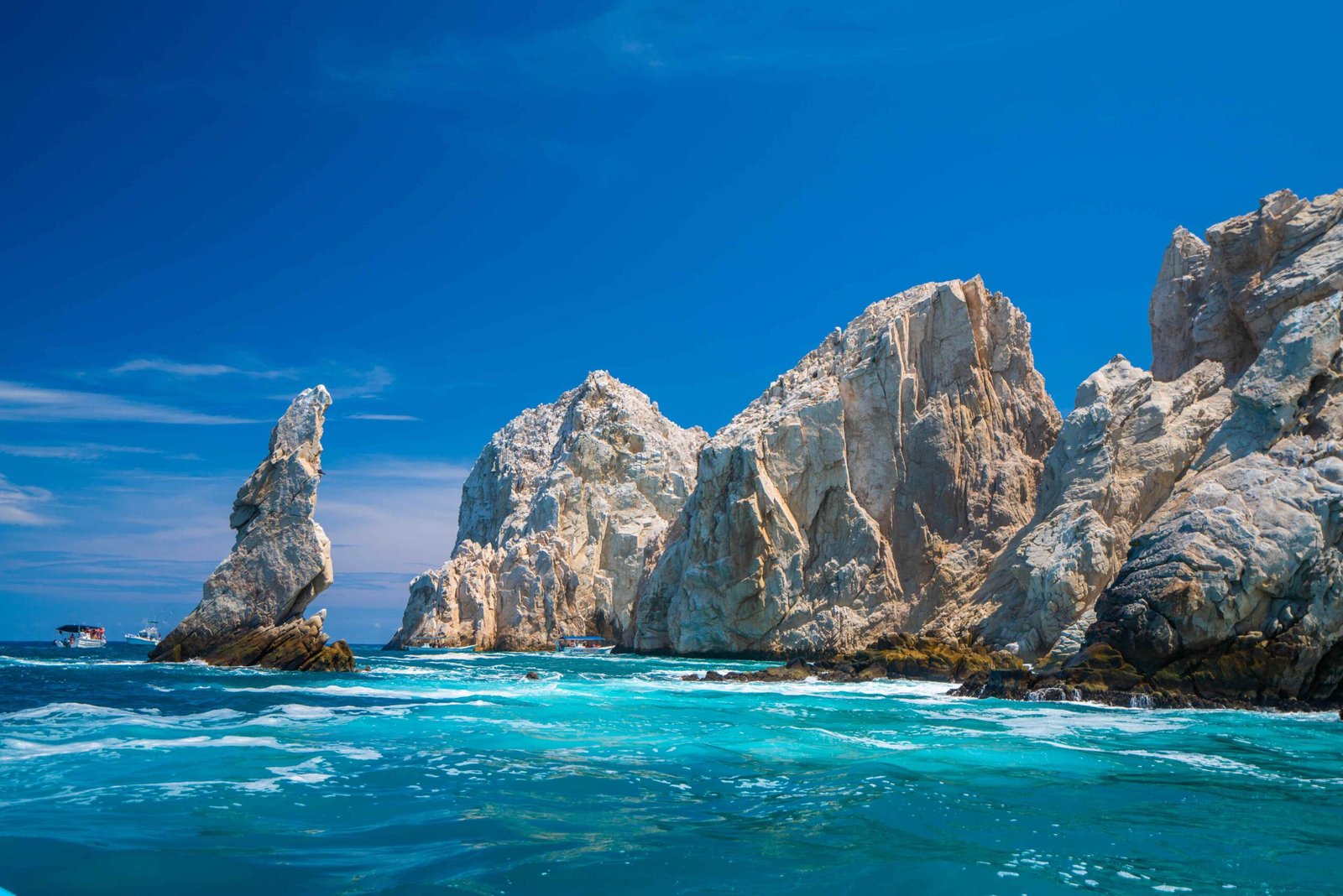 Entre os pontos mais emblemáticos de Cabo San Lucas está El Arco, formação rochosa que marca o encontro do Mar de Cortés com o Oceano Pacífico. A dualidade das águas deu origem a duas praias conhecidas: a Praia do Amor, voltada ao mar mais calmo, e a Praia do Divórcio, exposta às correntes mais intensas do Pacífico.