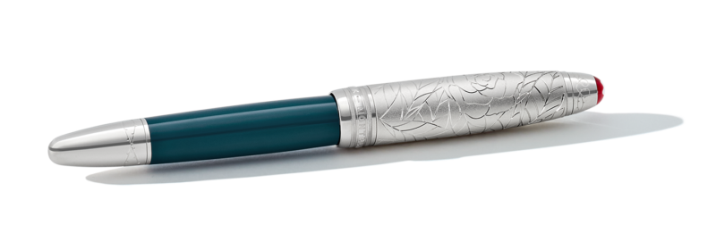 Já a Meisterstück Romeo Doué LeGrand Edition combina corpo em resina preciosa verde-azulada com tampa revestida de platina gravada com folhas. A interação entre luz e sombra, presente na história, aparece no contraste cromático e nos acabamentos. A pena em ouro maciço Au 750, também revestida a ródio, traz novamente a inscrição “Romeo”.