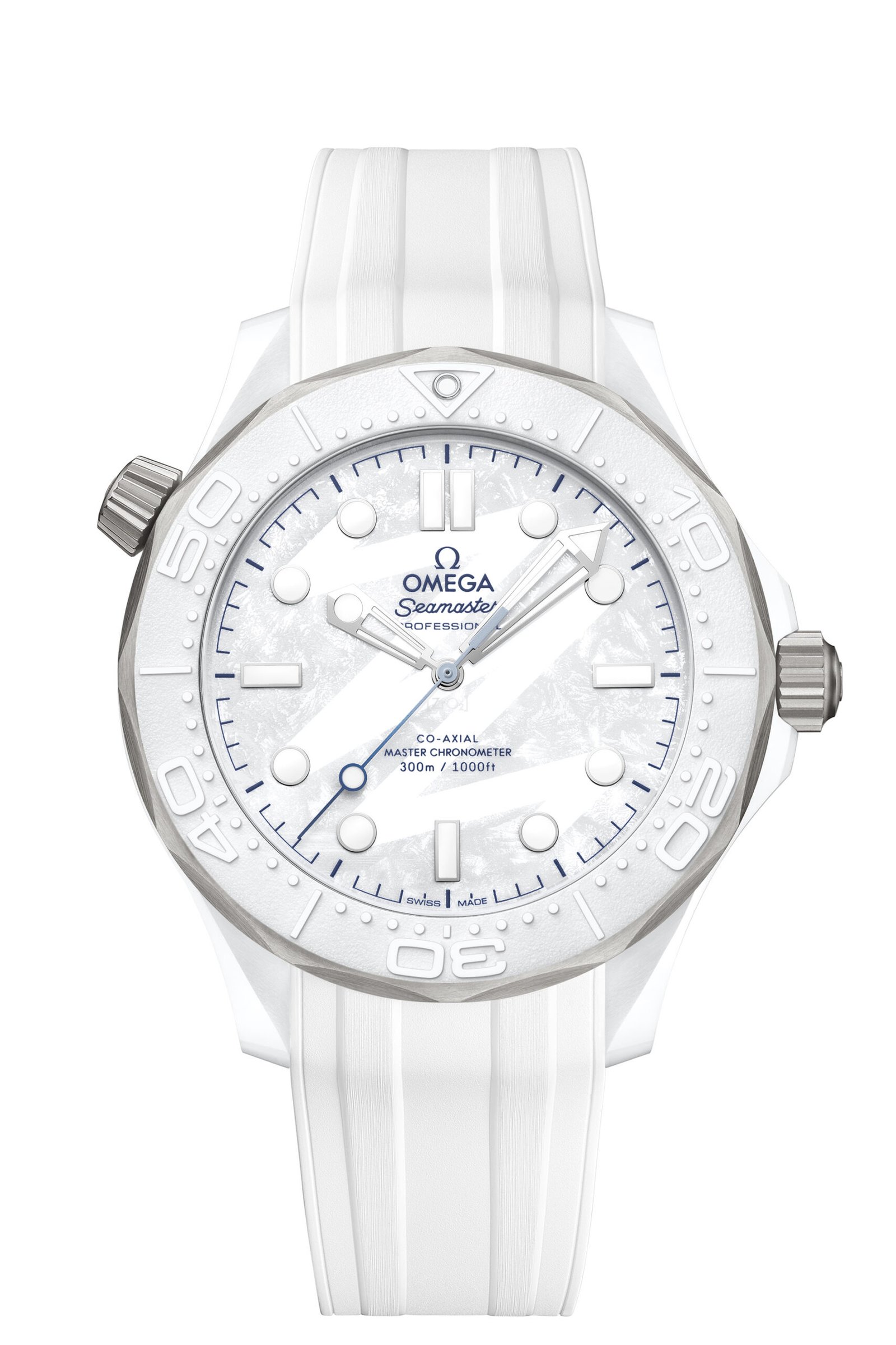 Para traduzir a atmosfera do inverno italiano, a OMEGA desenvolveu o Seamaster Diver 300M Milano Cortina em cerâmica branca e titânio grau 5, materiais reconhecidos pela leveza e alta resistência. Os diferentes acabamentos criam contrastes ao longo do design, incluindo caixa polida e escovada, válvula de escape de hélio e coroa com jateamento de areia. A luneta em cerâmica branca traz escala de mergulho gravada a laser em alto-relevo, reforçando a identidade técnica da linha Seamaster.