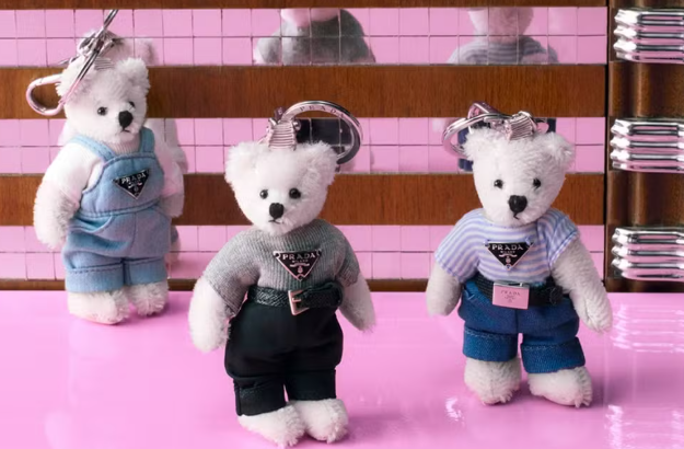 Nesse contexto, a Prada se move com o Teddy, uma linha de ursinhos de pelúcia transformados em acessórios de alto padrão. Cada peça veste versões miniaturizadas de looks da própria maison, o que conecta diretamente o personagem ao repertório de passarela da marca. Os Teddies são produzidos em edição limitada, aparecem em campanhas e nas redes como sugestão de presente e objeto de colecionador e, no e-commerce, ultrapassam com facilidade a casa dos 5 mil reais, deixando claro que pertencem à lógica do luxo e não do souvenir. Mais do que acompanhar uma tendência, a Prada incorpora o ursinho à sua estratégia comercial como extensão portátil do seu universo visual, pendurada na alça da bolsa ou presa às chaves como marcador de pertencimento.