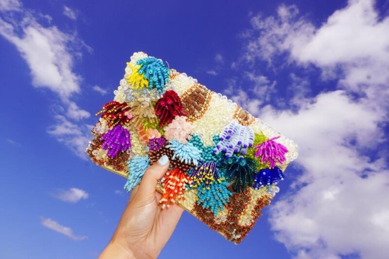 Entre os destaques da coleção estão os modelos lúdicos em formatos de tubarão, polvo e anêmona, que ampliam a dimensão narrativa da linha. Três bolsas surgem inteiramente bordadas à mão, com contas de vidro que criam brilhos e relevos, evocando texturas aquáticas. Entre elas, uma versão em formato de ostra reforça o caráter escultórico da coleção.