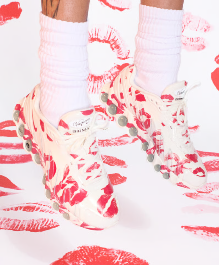 A Nike associou-se à Vaquera para reinterpretar o Air Max Dn8, modelo que incorpora a tecnologia Dynamic Air. Lançada a 8 de dezembro, a colaboração cruza inovação técnica com o universo irreverente da marca nova-iorquina fundada por Bryn Taubensee e Patric DiCaprio. A silhueta recebe marcas de beijos, elemento que introduz romantismo e ironia sem comprometer a funcionalidade. “O romantismo é um elemento fundamental da marca Vaquera”, explica Patric DiCaprio. O modelo está disponível por 200 euros nos sites das marcas, na Dover Street Market e em revendedores selecionados.