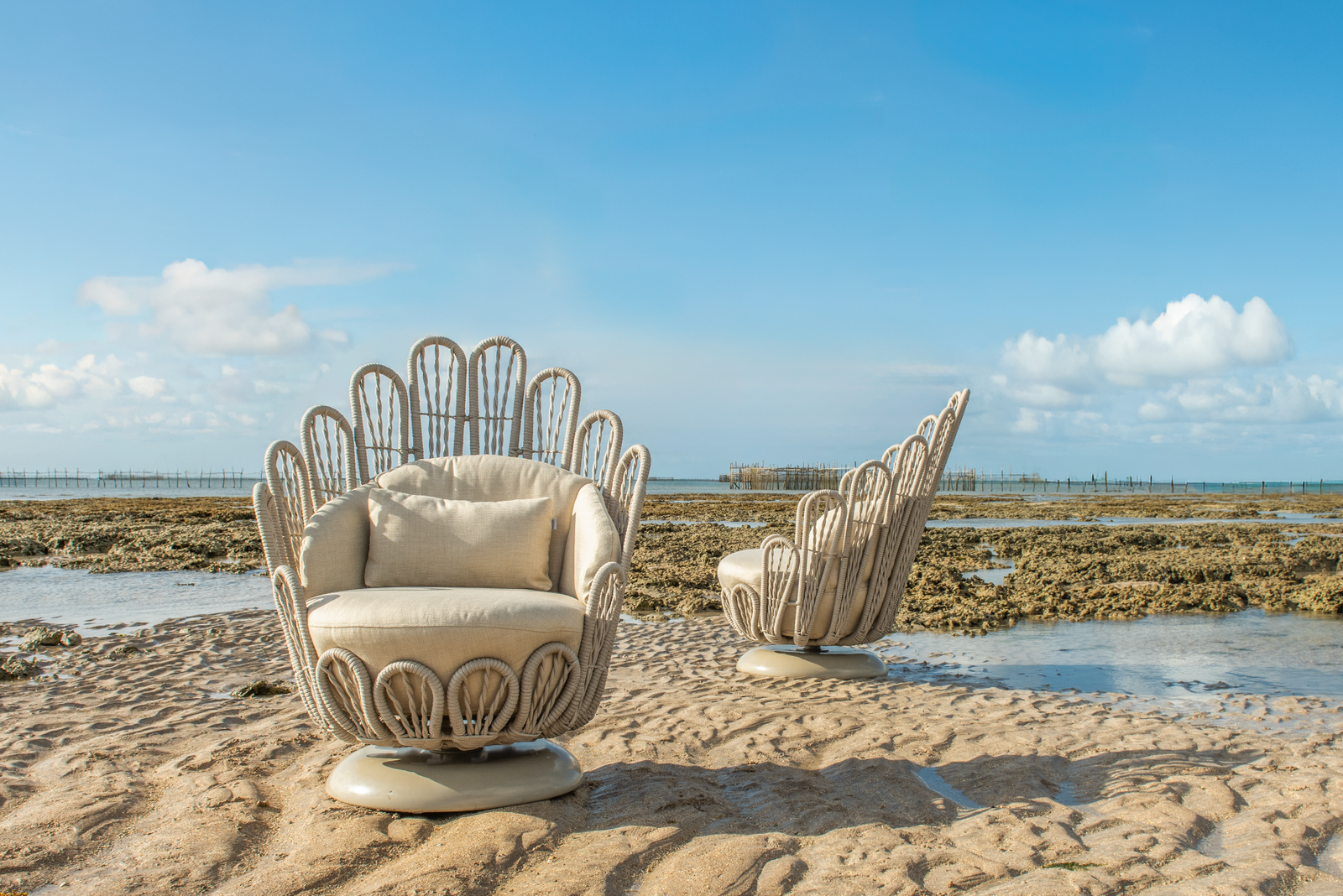 A primeira peça da coleção é a Poltrona Pérola, desenvolvida por Martha Medeiros e inspirada em São Miguel dos Milagres, no litoral alagoano. A artista desenha o modelo em formato de concha, traduzindo acolhimento e a simbologia do nascimento da beleza. “Dentro das mais raras conchas, nasce a pérola. E ela é você”, afirma Martha, trazendo para o mobiliário a mesma sensibilidade presente em sua trajetória na moda.