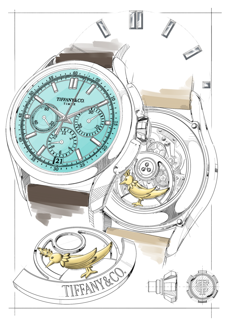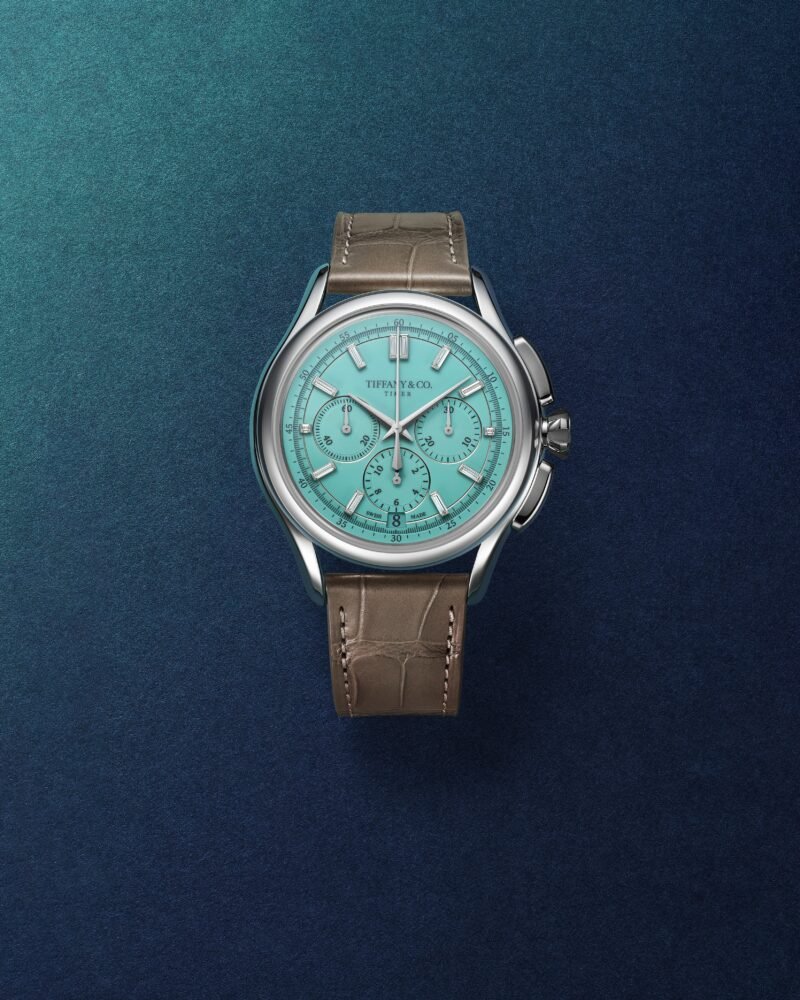 O novo Tiffany Timer traz caixa de platina polida de 40 mm, com linhas curvas e superfícies arredondadas. Os botões do cronógrafo acompanham o perfil da caixa e funcionam como protetores da coroa, que por sua vez recria a forma da cravação de seis garras do Tiffany® Setting. O mostrador em laca Tiffany Blue® recebe índices de diamantes lapidação baguete, referência direta à expertise da marca em gemas, enquanto os ponteiros são produzidos em ouro branco.